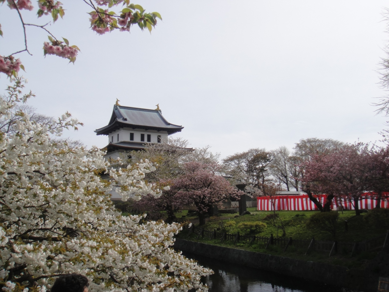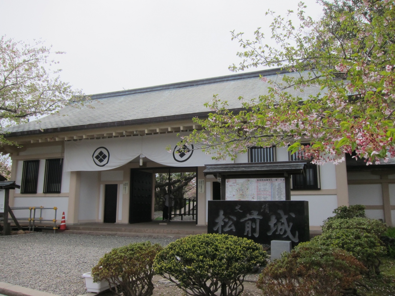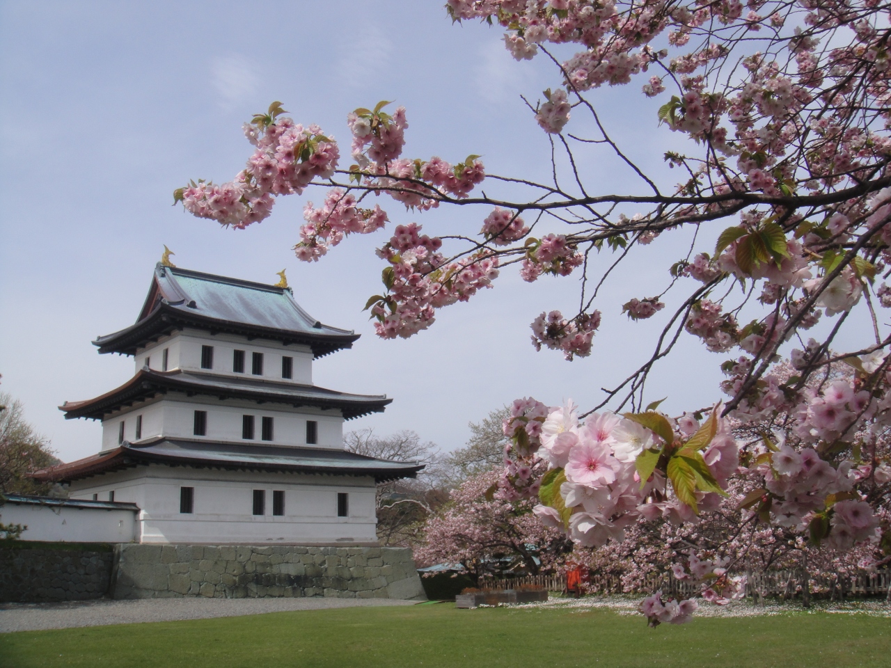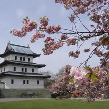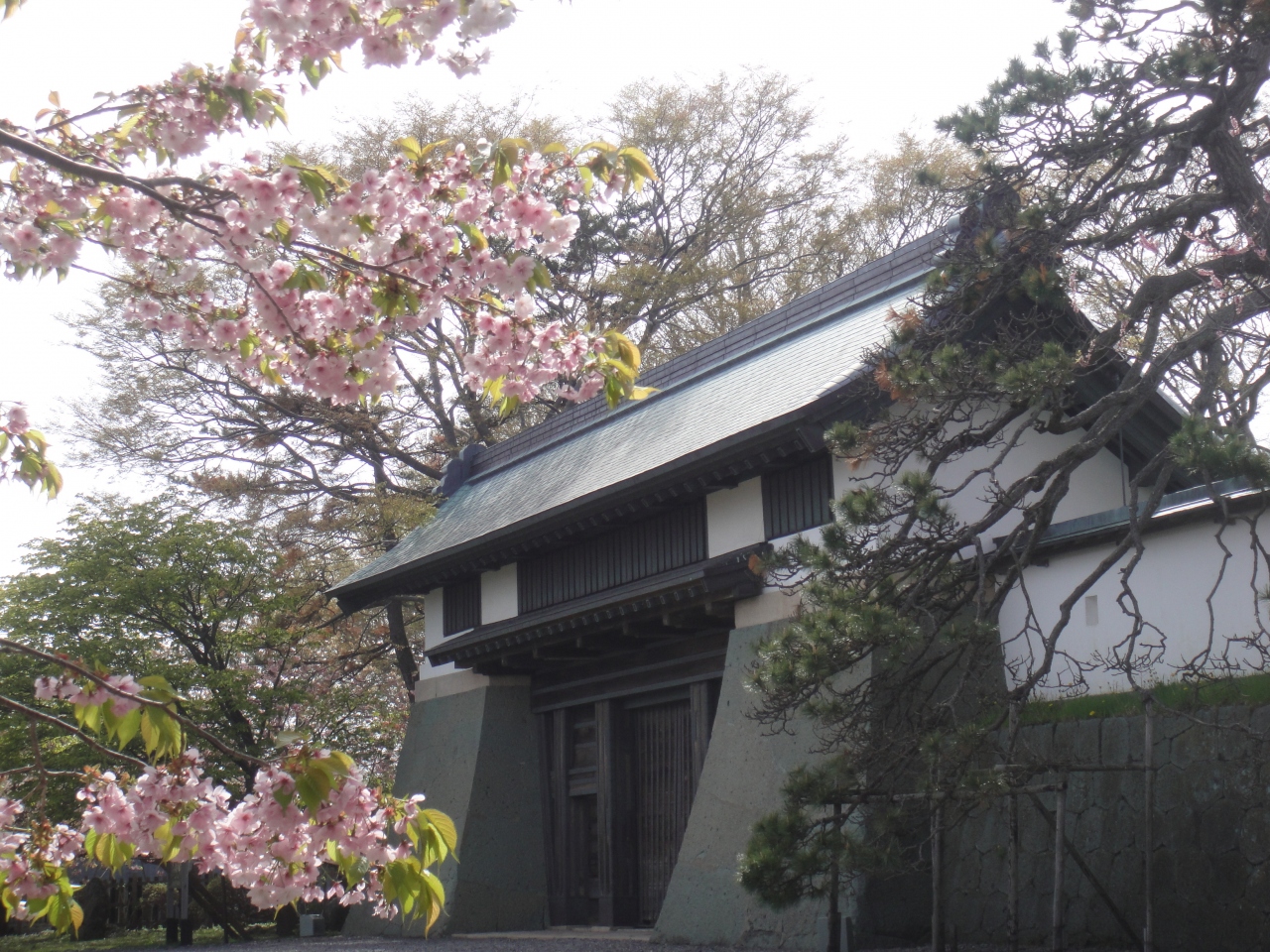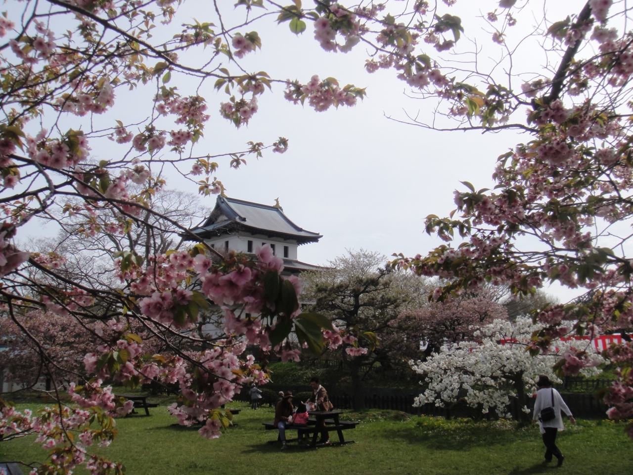 桜の頃に行きました。松前城の桜はソメイヨシノがやや散った頃に咲く南殿桜が多く、ほかにも蝦夷霞桜など、南殿桜のころに咲く品種も多いので、ソメイヨシノより1週間ほどずらして行くと良いと思います。松前城へはバスで行く場合は木古内より1時間ほど、松前バスターミナルよりも途中の松城(まつしろ)で降りると近いです。海岸線より少し丘を上がったところにあります。城は明治新政府による解体により建物はほとんど残っていませんが、それでも天守閣と本丸御門など3つの建物は残したそうです。それも昭和24年の大火で本丸御門などを残し焼失してしまい、今の天守閣は行ってみると分かりますがコンクリート製です。これなら燃えないでしょうが、趣は無くなってしまったような気がします。天守閣の中は武具や生活道具などの展示スペースになっています。入場料は350円、松前藩屋敷との共通券もありますが、藩屋敷は本物ではなく、平成5年に再現されたものです。映画セットのような地元のテーマパークといった趣なので、料金の割にはあまりおススメではありません。それより寺町巡りに費やした方が良いと思います。9時から17時までですが、桜まつりのときに行ったら5時以降、無料開放していました。