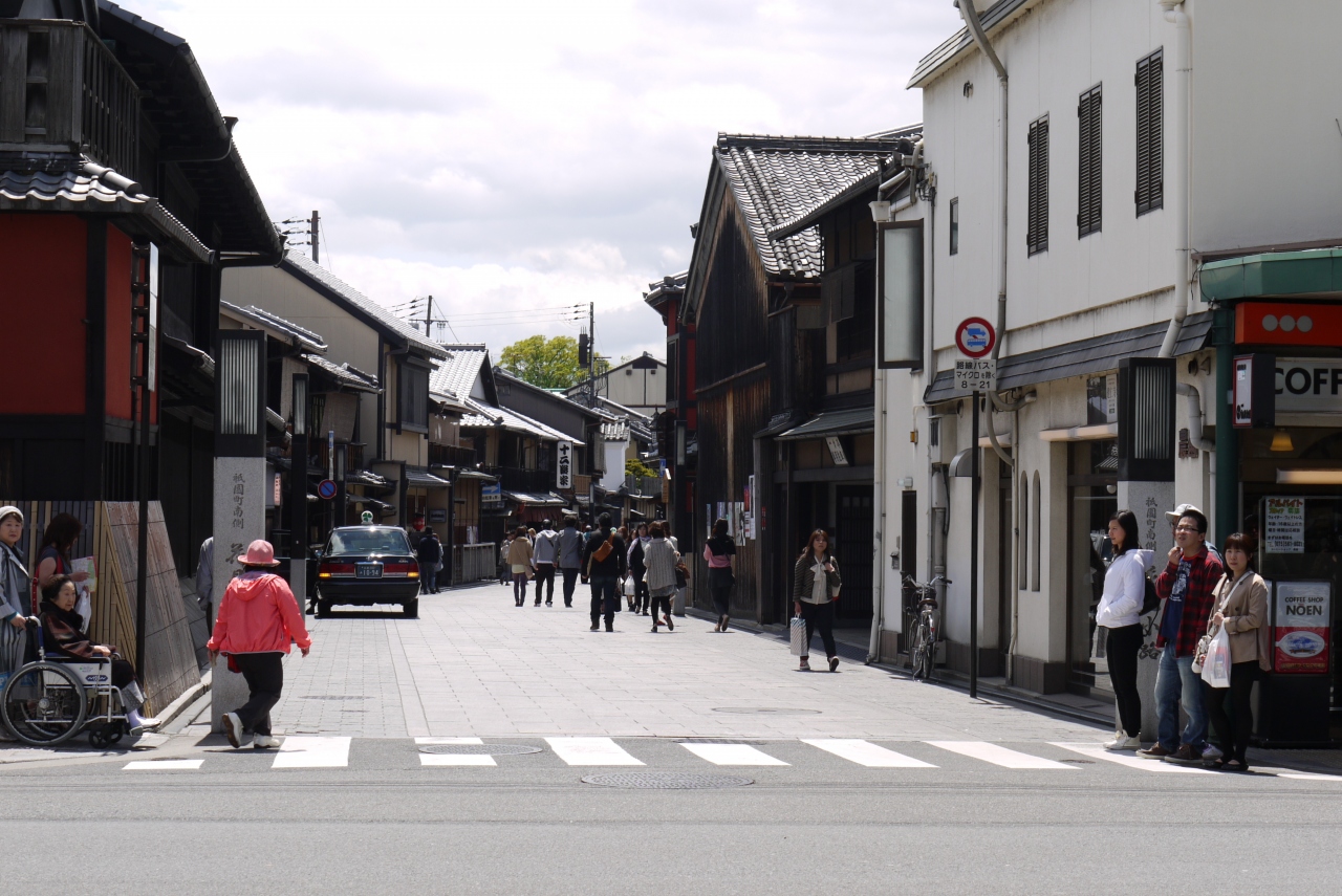 京都祇園。四条通り周辺。祇園と鴨川の間にある南北に伸びる小道。石畳の道の両脇には古風な建物が軒を連ね、雰囲気があります。京都らしい飲食店も多く、散策するのも楽しい。でも、歩行者天国ではなく、車の往来もあるので気を付けてください。