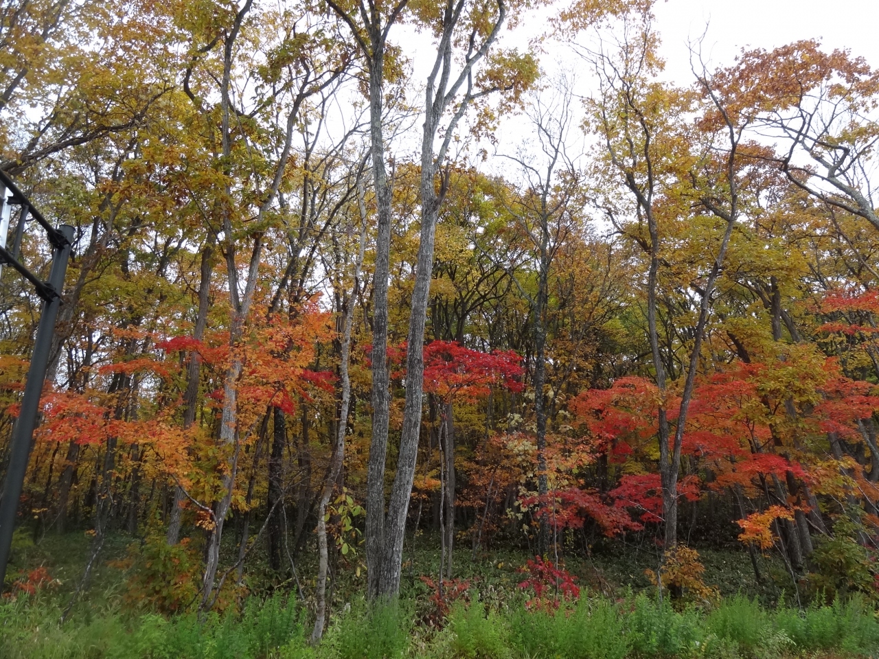 悪天候で駒ヶ岳の雄姿や青い湖面は望めず、湖面かなり波立っていて荒々しさを感じる大沼。でも、木々の紅葉がとても鮮やか綺麗で感激。