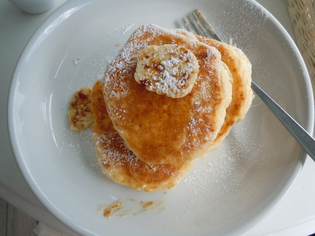 上に乗っているハニーコームバターの豊潤な味わいがまずガツンときて、それをフカフカのパンケーキが優しく包みこんでいく。