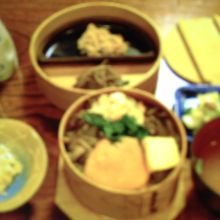 店内は和式で、畳の座敷です。ねぎ蕎麦とわっぱめしと郷土料理がセットになった御膳をいただきました。