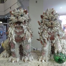 宮古空港1階ロビーの中央に鎮座する貝殻でできたシーサー像。これを見ると‘宮古島にきたぞ!’と実感します、宮古空港のシンボル的存在。色々な形の大小の貝殻をうまく組み合わせてできていて、どこから見ても綺麗‥すばらしい、これは芸術品です!