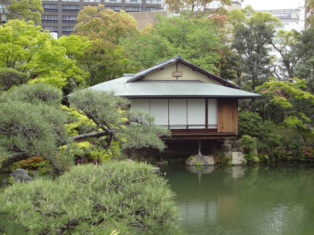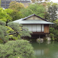 相楽園の池のほとりにある茶室です。元々は離れだった浣心亭と茶室又新亭がありましたが、本館とともに戦災で焼失してしまいました。戦後、離れのあった場所に茶室浣心亭を新築したそうです。緑と池の風景の中で落ち着いた佇まいです