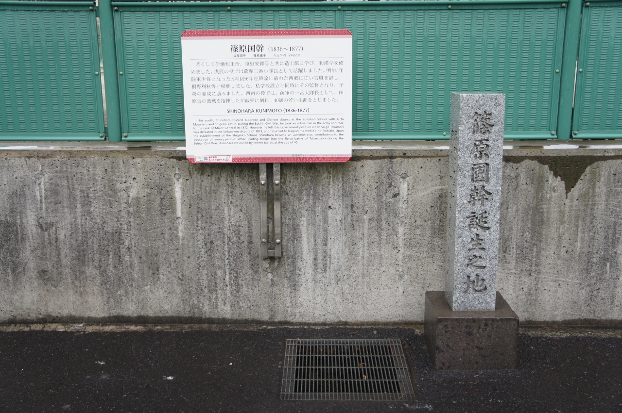 篠原国幹誕生地碑は、鹿児島中央高校横。小さな石柱が建っていました。