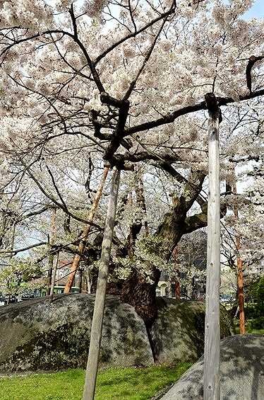 石割桜の周囲は柵で囲まれていますが、ぐるりと回って違う角度から枝振りを見てみるのがお勧めです。