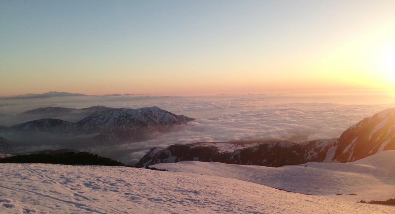 室堂駅の近くにある山です。スキーヤーやスノーボーダーが滑った後がたくさんありました。富山市街が見えます。雲海が見えたのでスノーシューで頂上までのぼると今まで見たことのない絶景でした。沈む夕陽も綺麗でした。