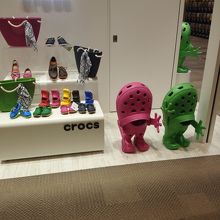 店頭には巨大なクロックスのデスプレイが置いてあり大変ユーモラスです。また、クロックスだけしかない専門店です。カラフルで履き心地が良いクロックスが沢山置いてあります。中には割引がされているクロックスがあり他店で買うよりお得な場合があります。