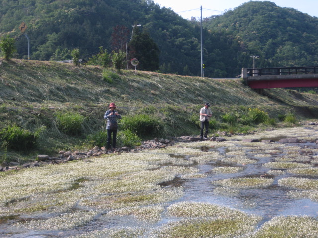 のどかな景色と本当に小さな川だが、よく見ると一面に可憐な花をつけた「梅花藻」が。