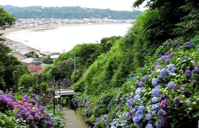 紫陽花の先に由比ヶ浜が見える絶景