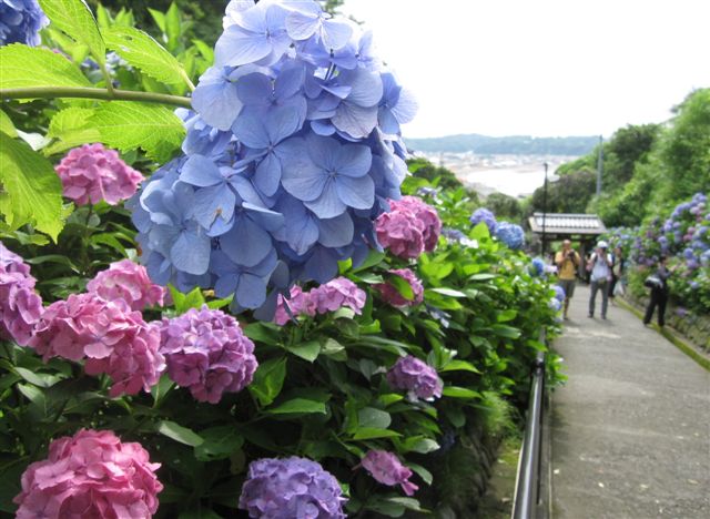 寺の前の道の両脇に紫陽花が沢山植えてあり、紫陽花と紫陽花の間の道から由比ヶ浜が見えるのです。その景色が素晴らしい。