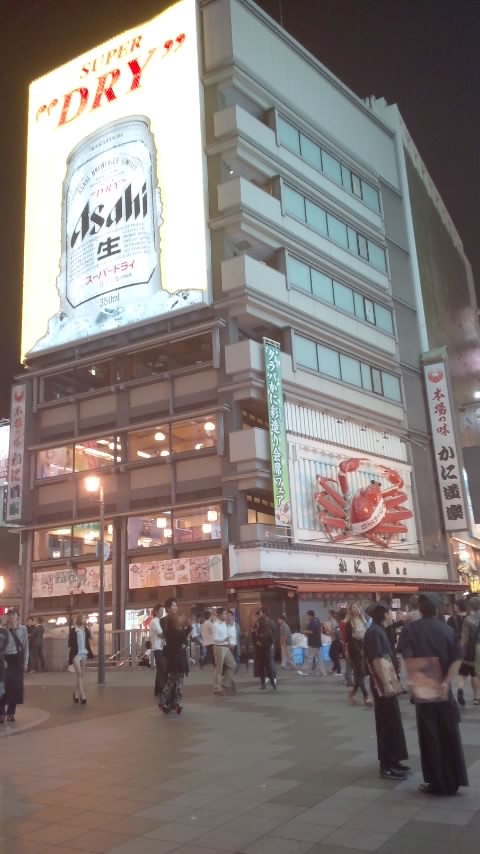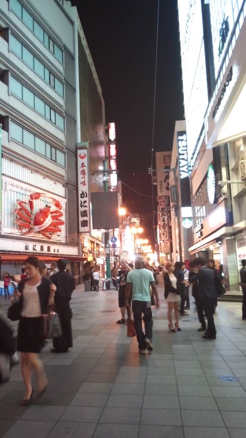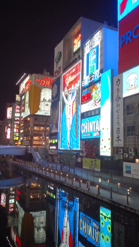 いつも多くの観光客でにぎわっています。道頓堀川に歩道が舗装されてから、とてもいい感じになりました。昔は汚いイメージでしたが、今はそんなことありません。道頓堀の川がそのうちプールになるという噂です。夜はグリコの看板がきれいです。