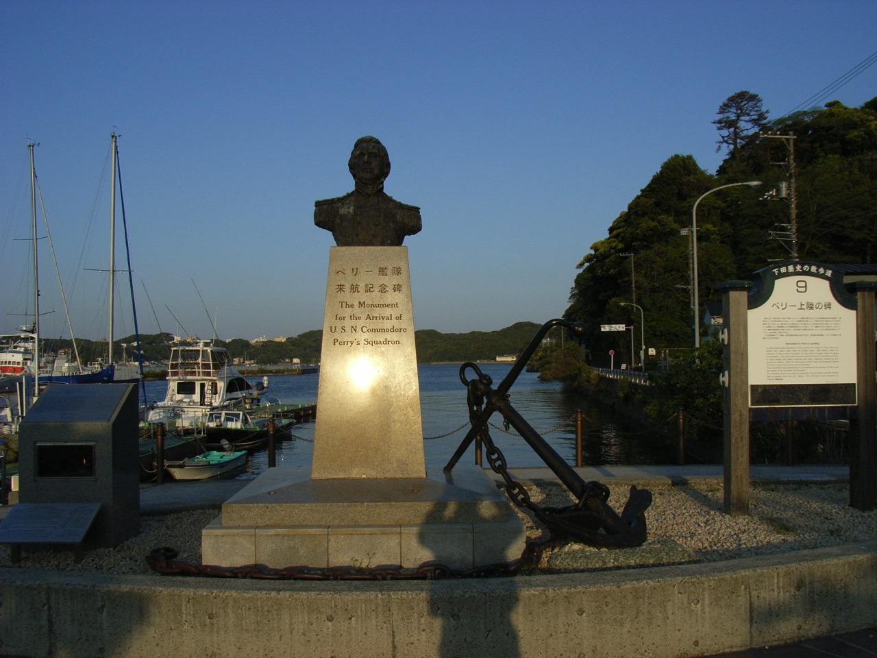 ペリー艦隊来航記念碑は、静岡県下田の地にあります。アクセスは、伊豆急下田駅より徒歩15分の場所ですが、駅から歩くと途中に案内板がないので不安になります。記念碑に着くときれいな海と整備された港が美しい。150年以上前の歴史が蘇ってくるようです。ペリー提督の胸像と錨が設置されています。胸像は下田条約調印の地、了仙寺の方向を向いています。趣ある場所です。