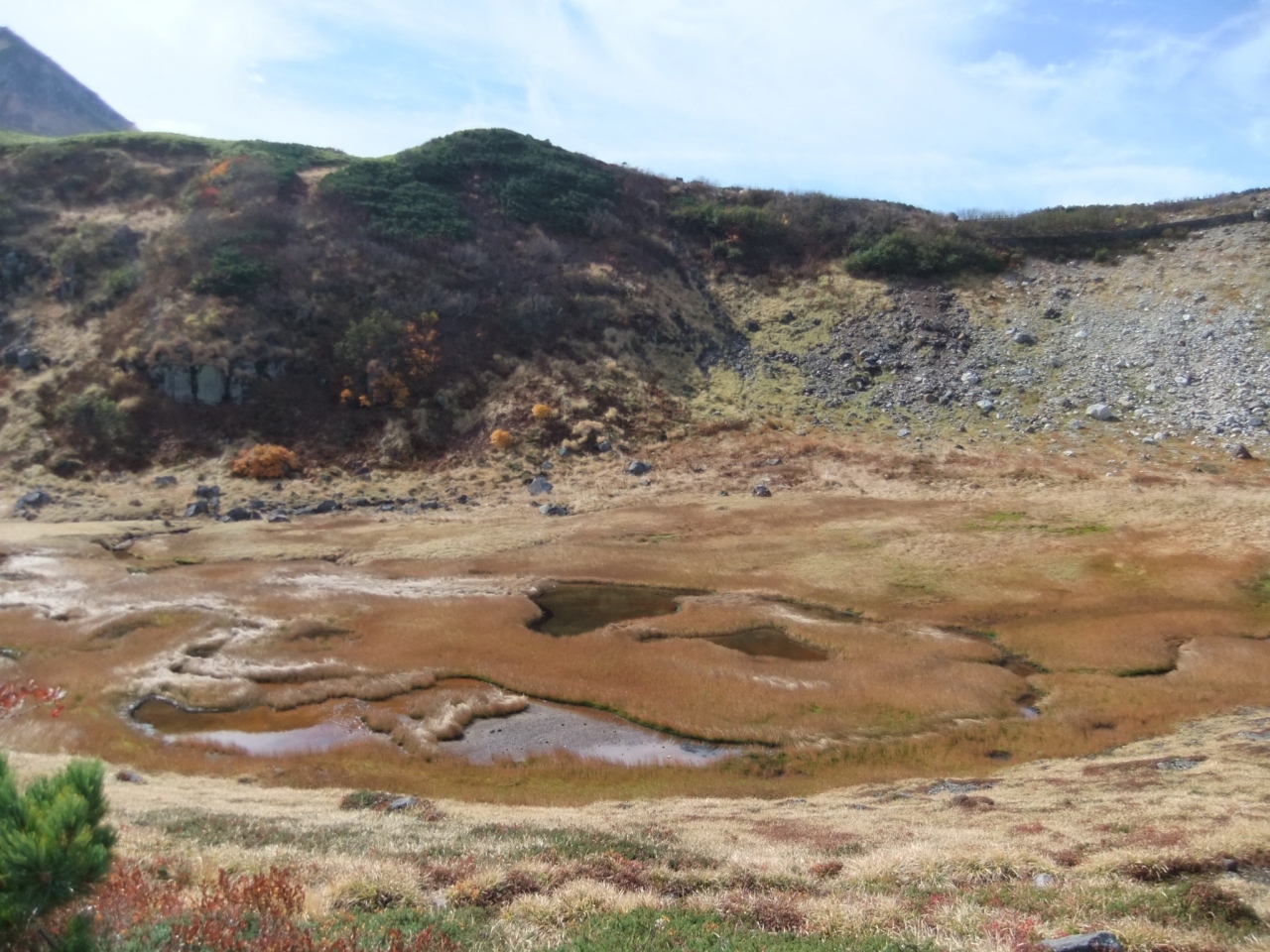 みくりが池周回コースに見られる血の池。名前から見ると、赤色の池と連想でき、写真を見て、現物がすごく期待したが、結局、池がちょっと乾くて、期待を裏切った。にもかかわらず、みくりが池や普通の池とは違うと分かる。次回、血の池は本当の姿を見に行きたい。