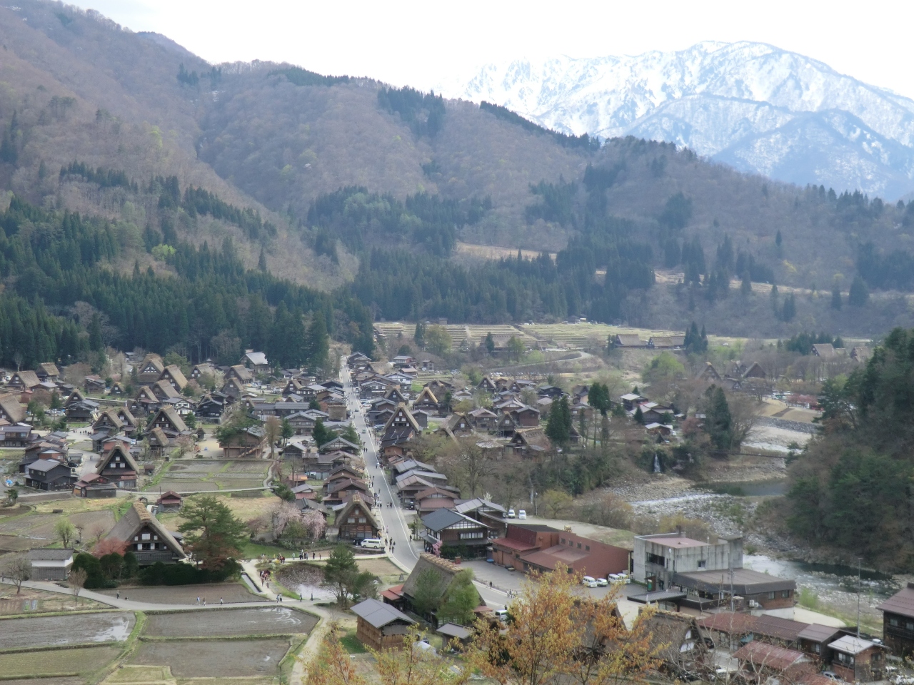 白川郷の中心道路が、ほぼ展望台に向けてまっすぐ走っているので、