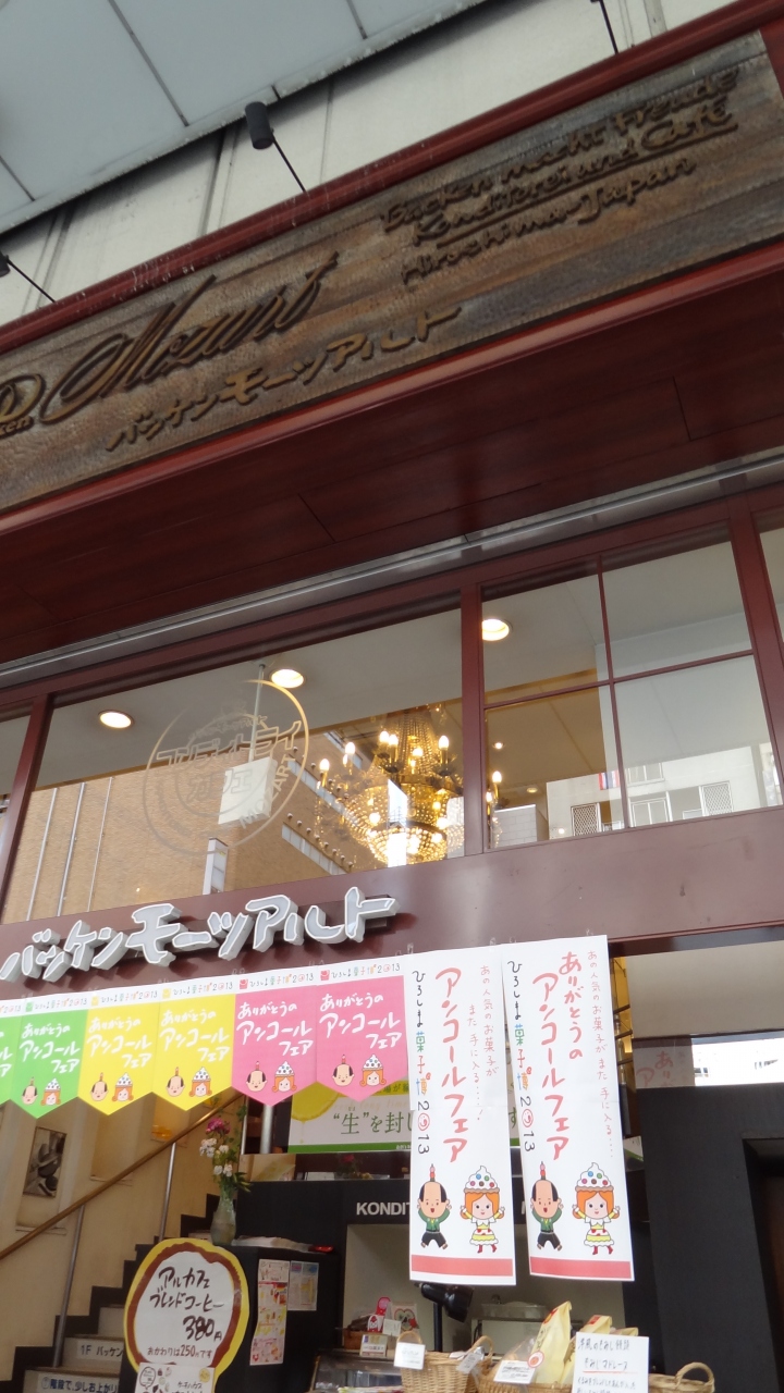 ここのバッケンモーツァルトは広島市の一番の繁華街、堀川町にあります。喫茶店でもあり、持ち帰りのお菓子も売っています。古い木の看板がヨーロッパのおもむきがあってとても素敵です。広島ならではのケーキも売っていました。広島では、本当に有名で地元を十分アピールできる、頼りがいのある洋菓子屋さんです。