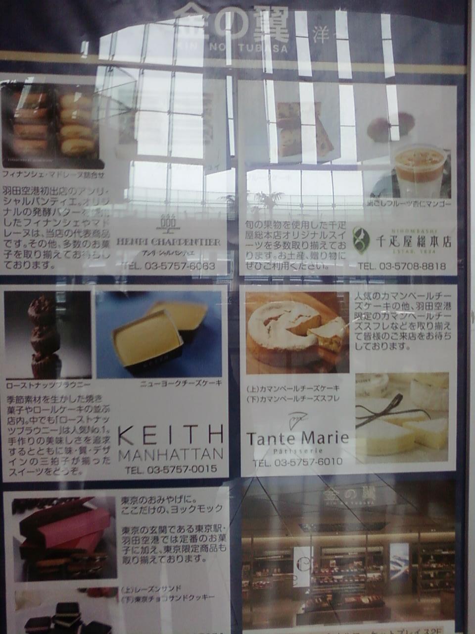 金の翼は羽田空港国内線ターミナル、搭乗する前の保安検査口や、さまざまな航空会社のカウンターのある、2階にあります。アンリ・シャルパンティエさん、とらやさん、千疋屋さんなど、魅力的な和菓子や洋菓子のお店が集まっています。どの店舗もとてもおしゃれで、選ぶのが難しいです。しいていえば、アンリ・シャルパンティエさんの季節のマカロンがお勧めです。