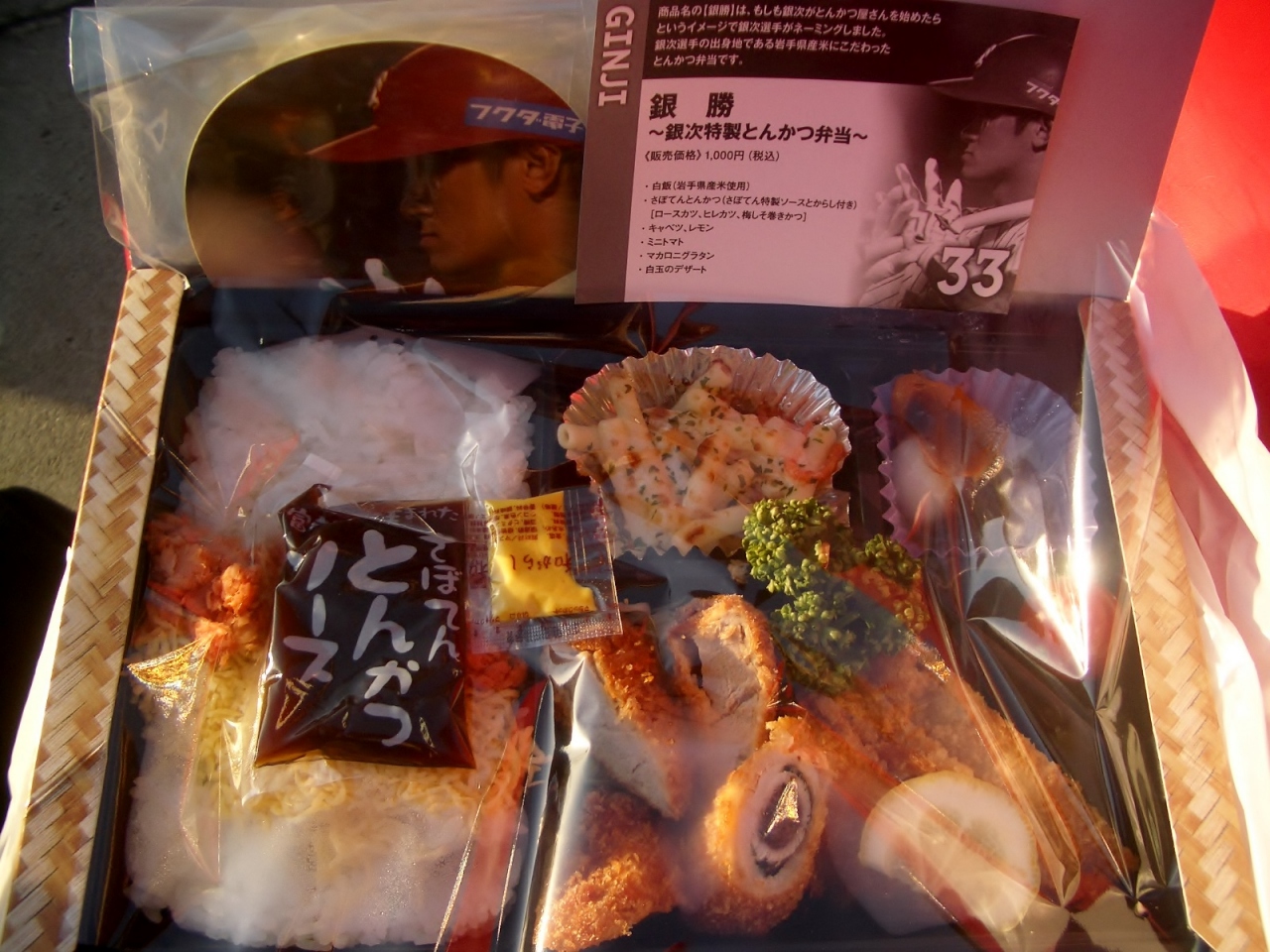 今回頂いたお弁当は、Kスタ宮城内の伯養軒のブースで売られている、選手プロデュースのお弁当「銀勝弁当」です。さぼてんとのコラボです。3種のとんかつの他に、ご飯にはそぼろが乗っていて、白玉のデザート付き、おいしかったです。