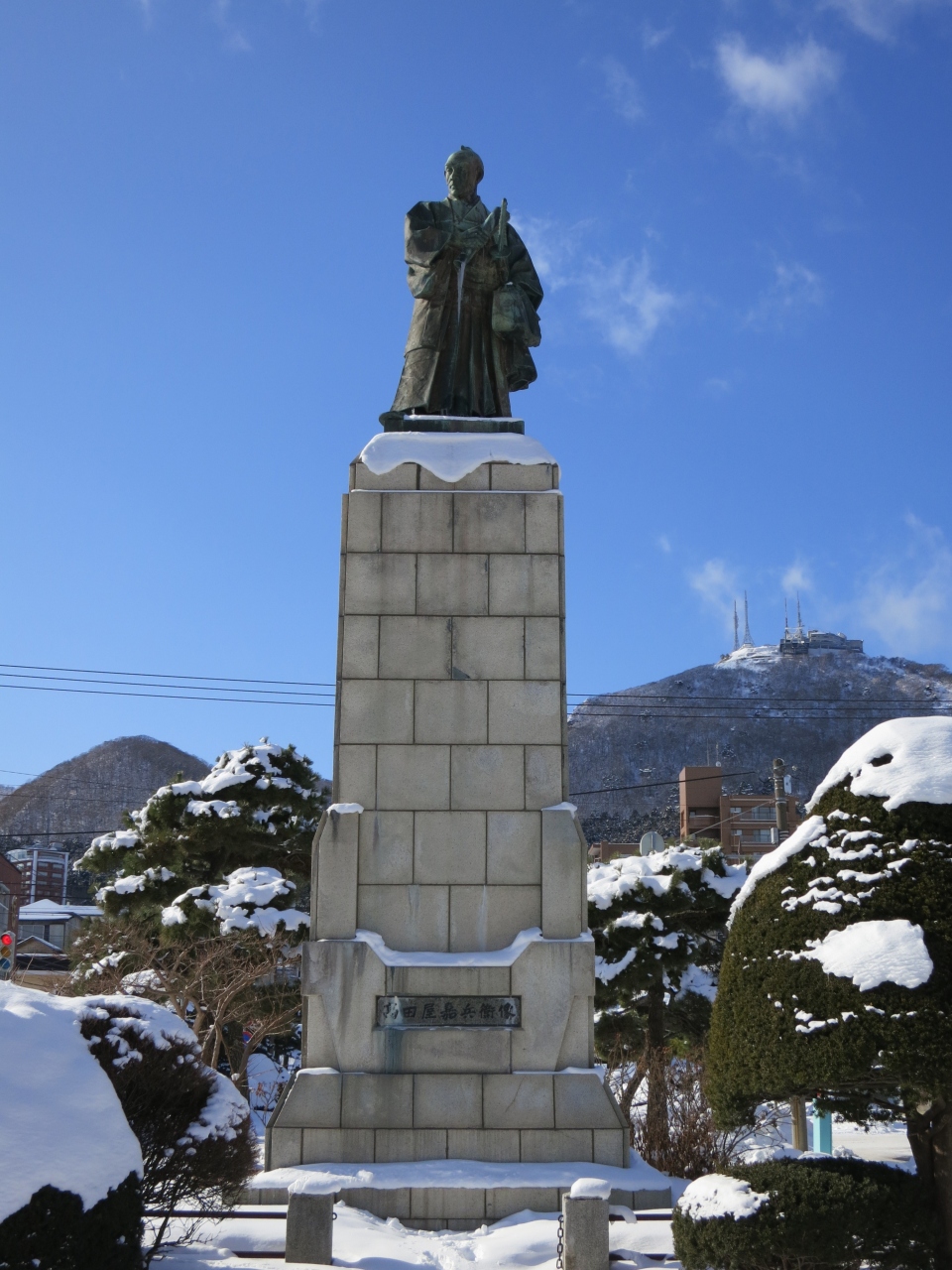 護国神社の坂の下に大きくどーんとそびえたっているのがこの高田屋嘉兵衛像です。歴史に詳しい人や、地元の人以外で知っている人はなかなかいないかもしれませんが、函館で活躍した商人だそうです。