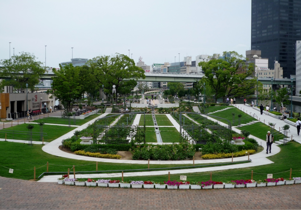 堂島川沿いのバラの小路から中之島公園までバラが咲き乱れます。