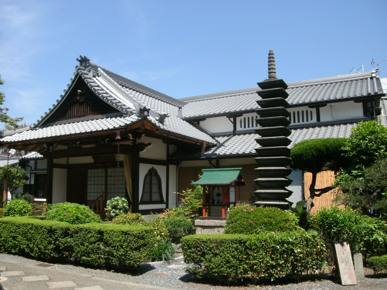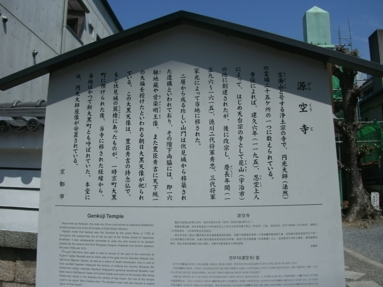 「源空寺」さんは、京阪電鉄伏見桃山駅を降り大手筋商店街へと入り、その中ほどにあるみずほ銀行の角を北に入ると10m先に鎮座されています。宝海山(ほうかいざん)と号する浄土宗の寺で、円光大師(法然)の霊場25ヶ所の一つに数えられています。寺伝によれば、建久6年(1195)忍空(にんくう)上人によって、はじめ宇治の炭山の地に創建されたが、慶長年間(1596〜1615)当地に移されたもので、本堂には、円光大師座像を安置し、二層からなる山門の階下両脇には、石仏六体地蔵、愛染明王像及び朝日大黒天像が祀られています。