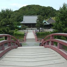 池の中央に太鼓橋、その向うに本堂が・・ガイドなどでお馴染みの光景がありました。