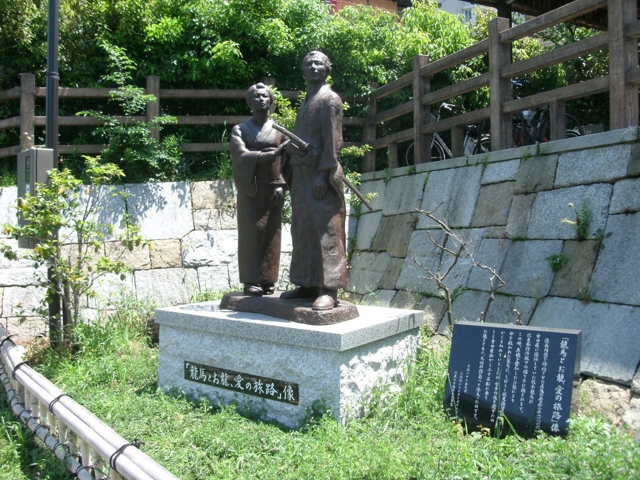 「龍馬とお龍 愛の旅路 像」は、寺田屋の南側の川のたもとに建っています。竹田街道(府道115号線)と宇治川派流の交差する“京橋”の欄干からもよく見えます。平成23年9月に京都桃山ライオンズクラブの結成50周年記念事業として、建てられたてられたものです。龍馬は慶応2年(1866年)の“寺田屋事件”でお龍に助けられ、負った傷を温泉で癒すため、お龍と一緒に三十石船に乗り、鹿児島の霧島へ新婚旅行に出かけたことから“愛の旅路像”となったらしいです。銅像は等身大で、仲良く寄り添って遠くを眺めたような表情しています。
