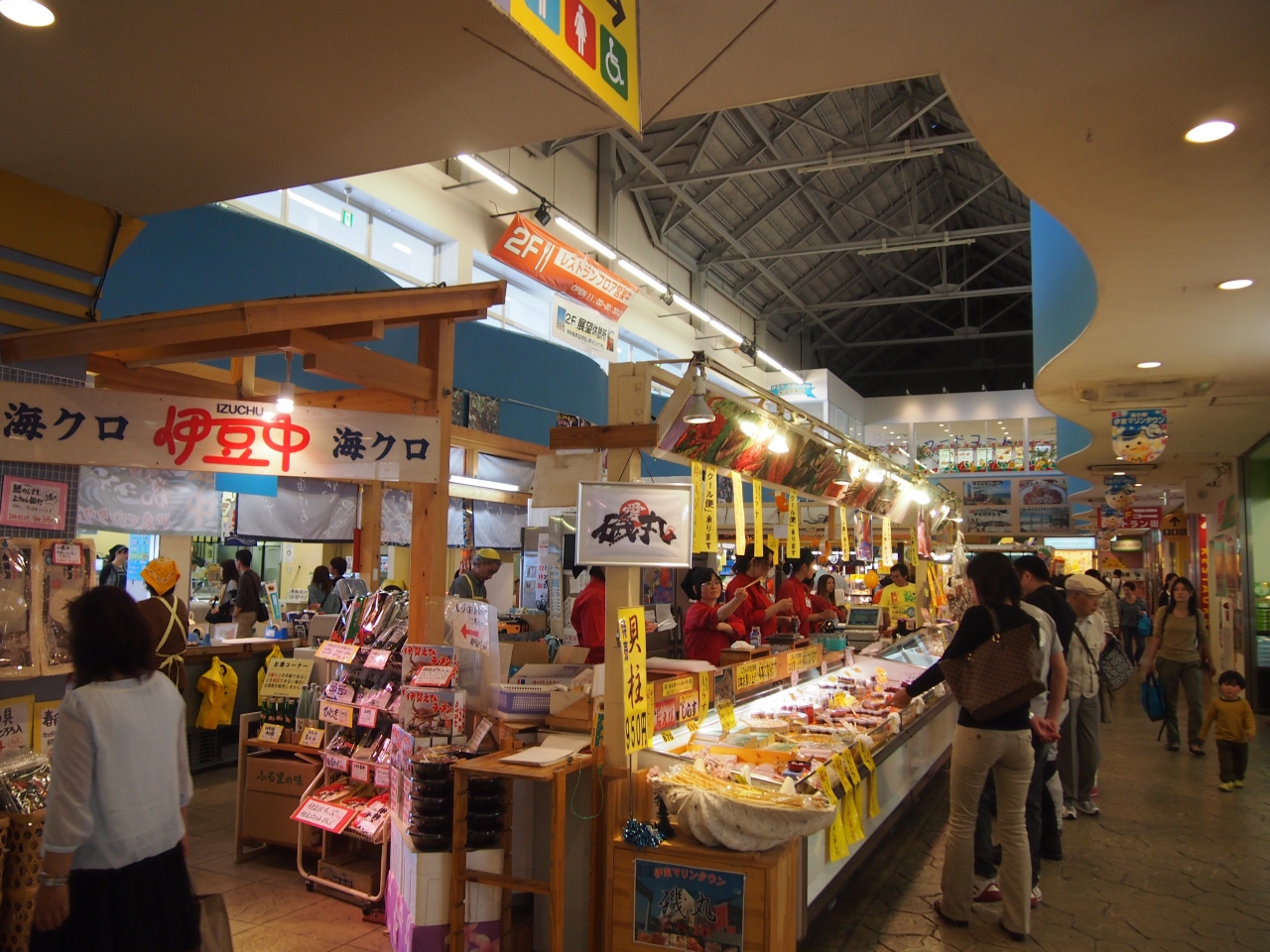 伊豆に旅行に行った時は必ず立ち寄る道の駅。 道の駅にしてはお土産屋さんも何店舗もあって充実してるし、お食事も色々あり、試食コーナーもたくさん。 いつ行っても賑わっていて楽しいスポットです。 外観がとてもカラフルなのも、見てるだけで楽しい! お土産は、クッキーなどのばらまき土産から、干物などの特産品、おつまみ系、キーホルダーなど何でも揃うので、家族それぞれで好きな店を見て、店内で待ち合わせをしたりします。 海沿いに建っているので、青い海を望めるのも嬉しいです。