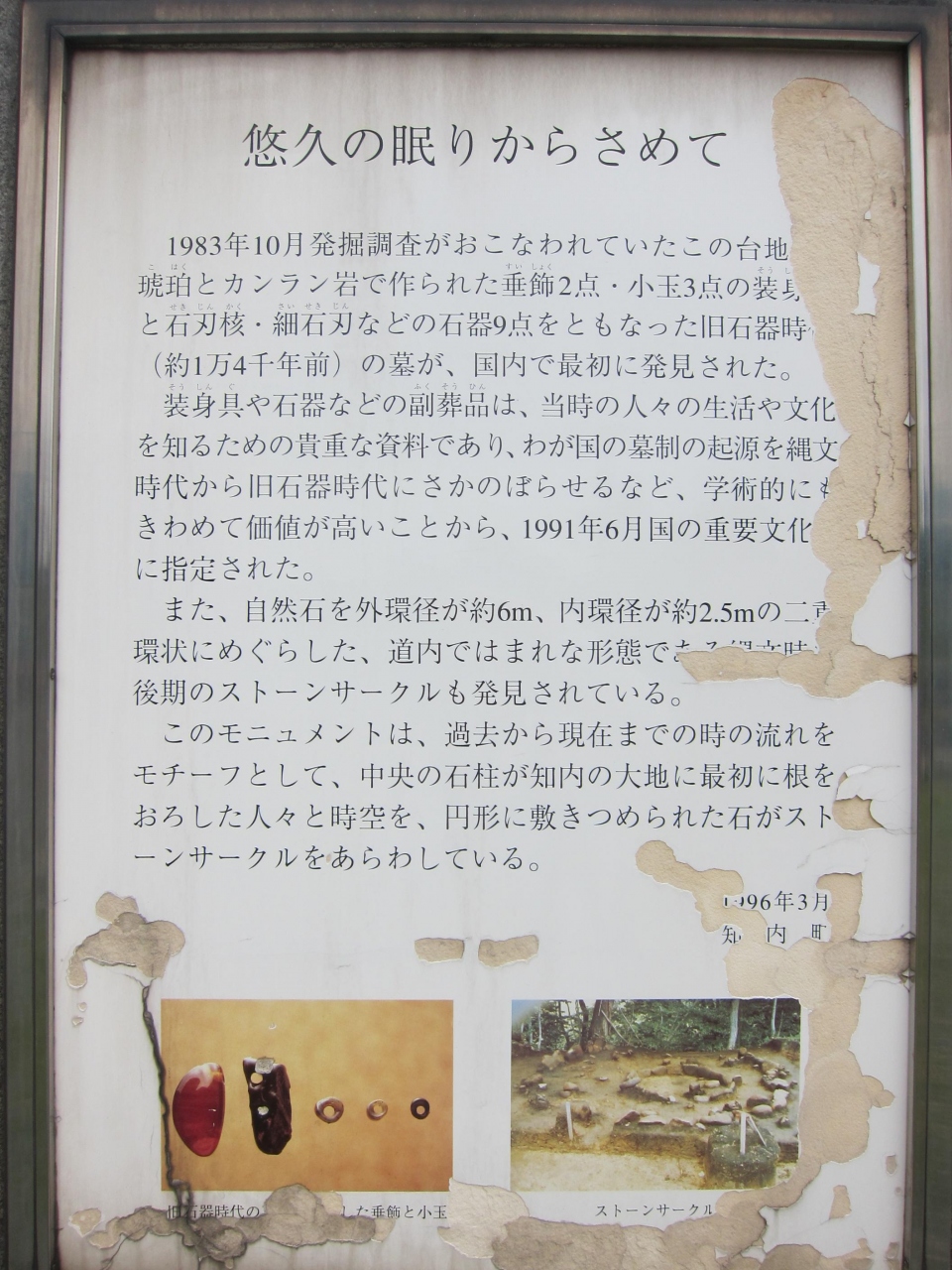 道の駅しりうち(JR知内駅)の手前の広場の一角にあります。歴史モニュメントというのが建っていて、「最古の墓」に関する説明書きがあります。付近からの出土品は国の重要文化財ということもあり、自称最古という訳でもなさそうです。ストーンサークルも見つかっているようで、隣の道の駅のトイレはその形を模しています。道の駅しりうちはJR津軽海峡線の知内駅を併設していて、1日に特急のみが上り2本、下り2本しか止まりません(お得かどうか分かりませんが、特急券なしでいけるそうです)。新青森~函館の新幹線ができたら無くなってしまいそうです。他に木古内~松前のバスが「知内駅前」で止まります。