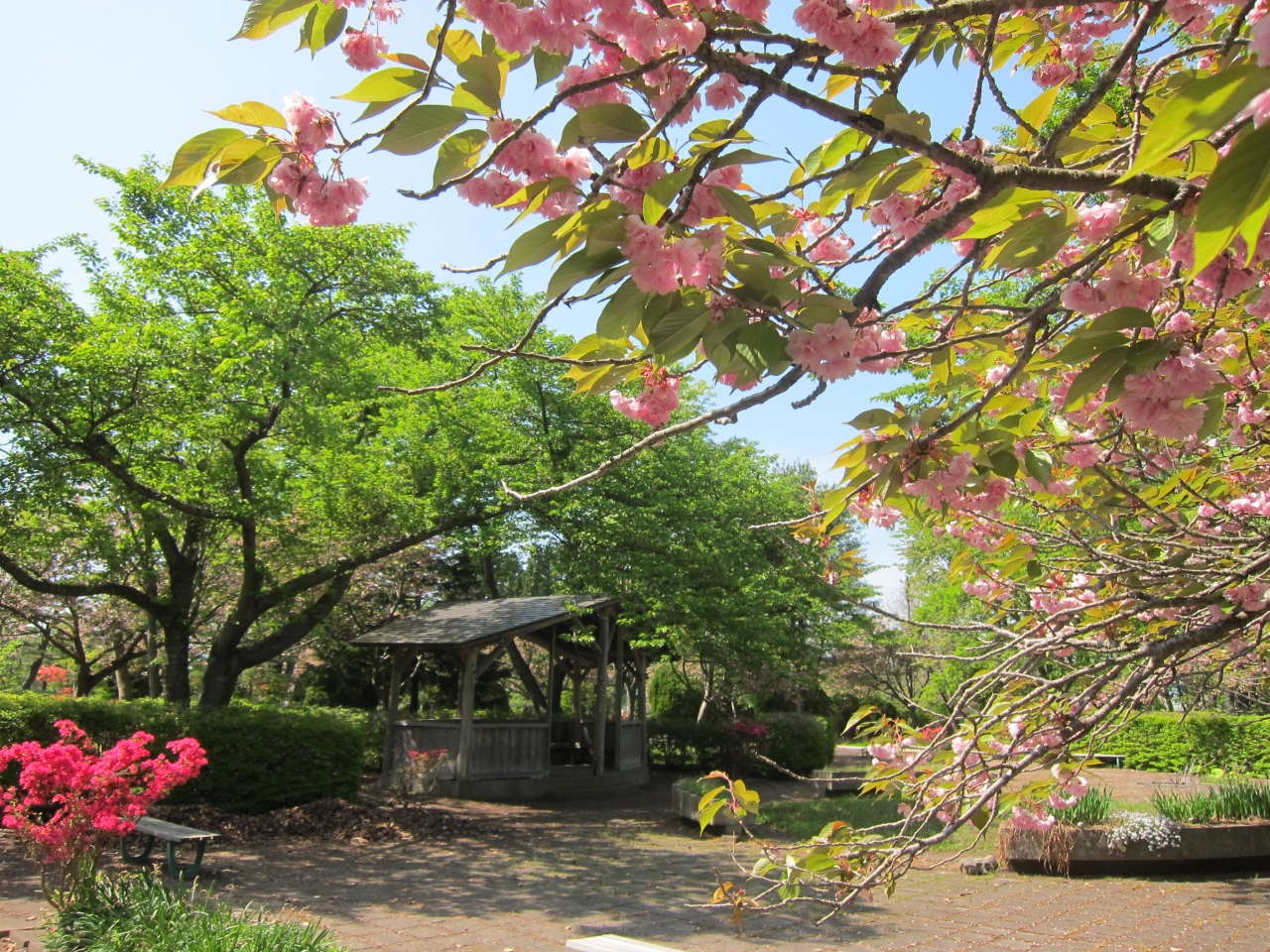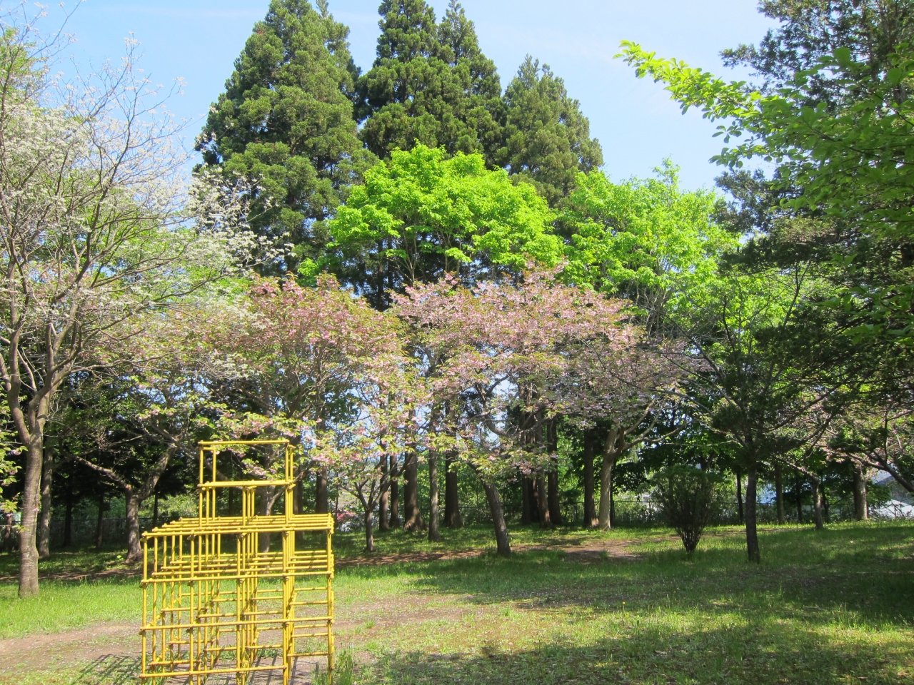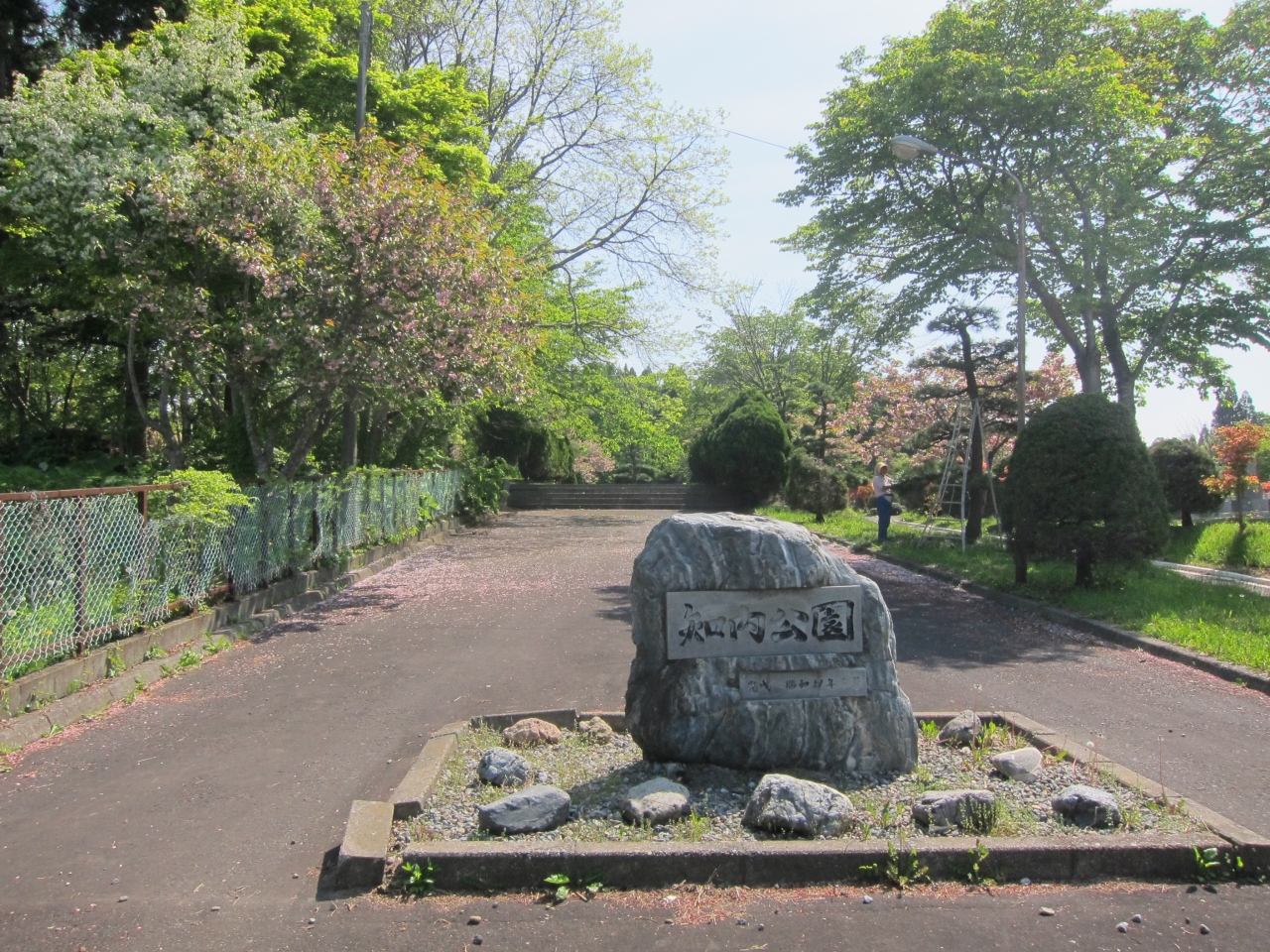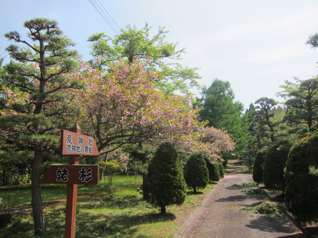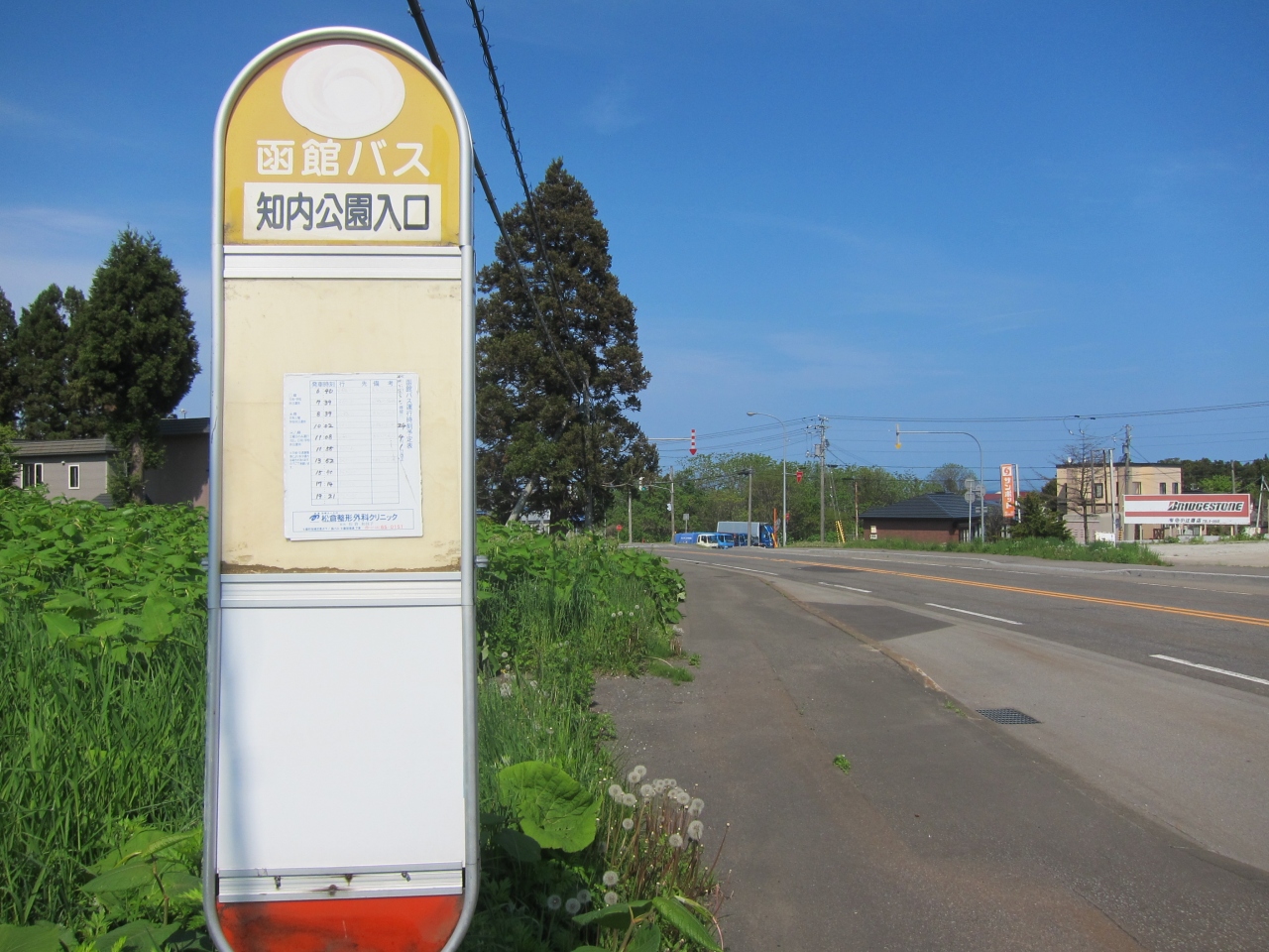 知内町役場などがある町の中心部から南へ、国道228号線を知内川を渡って2~300mほど行ったところにあります。国道からわき道に入った奥です。荒神社を中心として公園として整備されています。公園のポイントは荒神社と北東角にある姥杉で、緑が多く広場や遊具なども多少あります。また荒神社に向かって多少傾斜を登る傾斜地です。神社は簡素ではありますが、しっかりとした言われがあるので、由緒の書かれた石碑を読んでみるとよいと思います。木古内~松前の路線バスのバス停「知内公園入口」下車で、道路わきに「知内公園」の標識があります。奥に目をやると杉林?のようなうっそうとした一帯があるので、そこが公園です。6月の初めに行きましたが遅咲きの山桜が公園内各所に植えられ、咲いていました(開花の遅い年でした)。付近のお店にセイコーマートが1軒ありました。