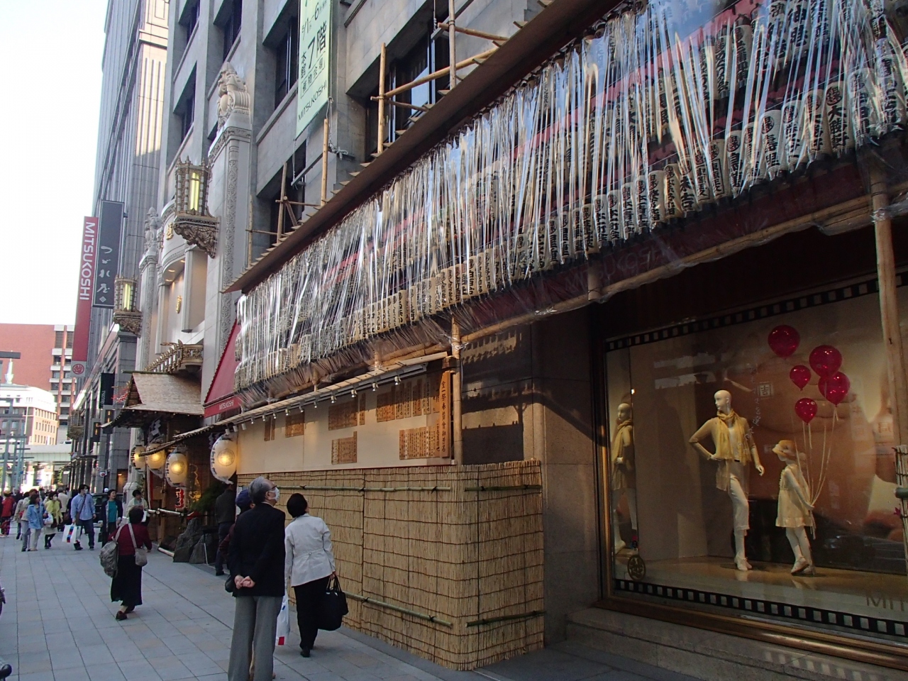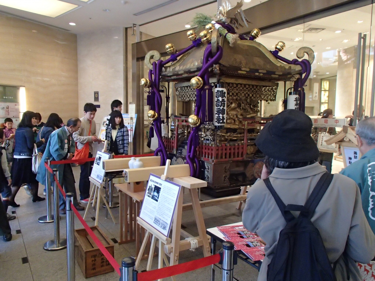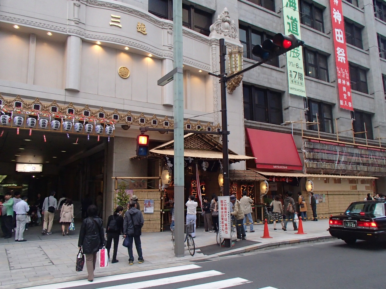 三越 日本橋本店 (みつこし にほんばしほんてん) では、5月になると地元のお祭りに参画しているようで、店先におおきな神輿や神社を設営し、1年の無行息災を願う行事を行っていて、多くの人が特に、神輿を見て楽しんでいます。ぜひ