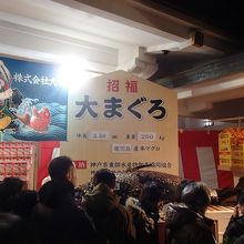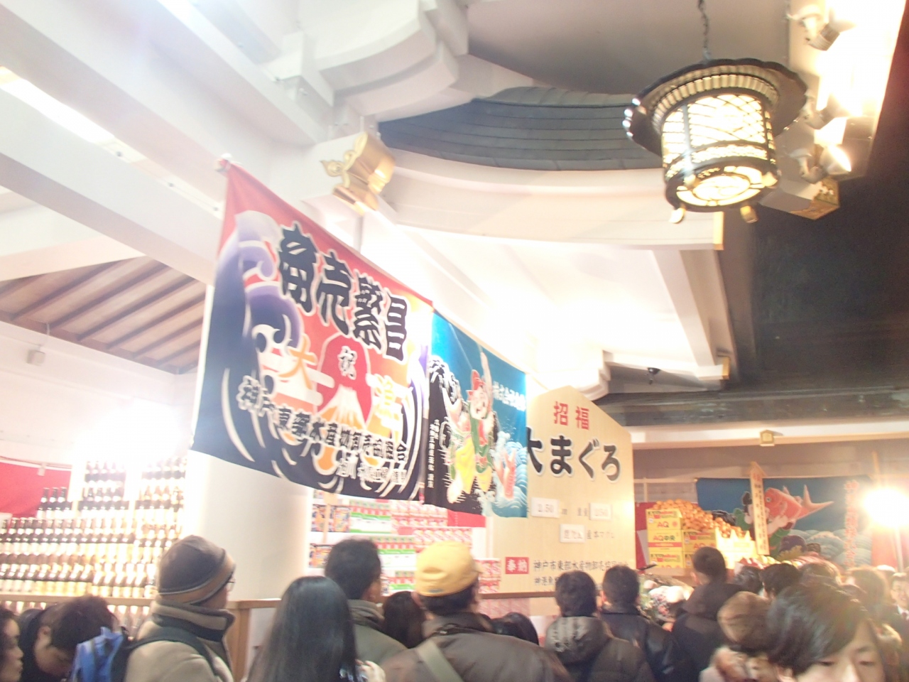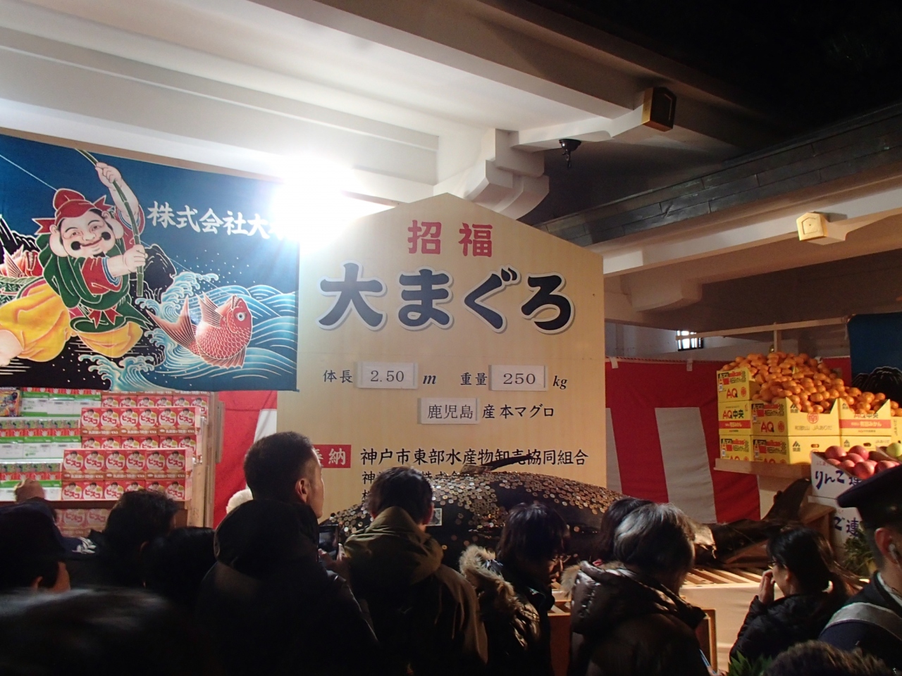 西宮神社 (にしのみやじんじゃ)では、多くの食べ物が奉納されています。大まぐろのその一つで、今年は250Kgの鹿児島で取れたマグロとの事で、小銭をマグロに付ける方が長蛇の列をなしていました。ぜひ、一度、行ってみてはどうでしょうか