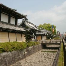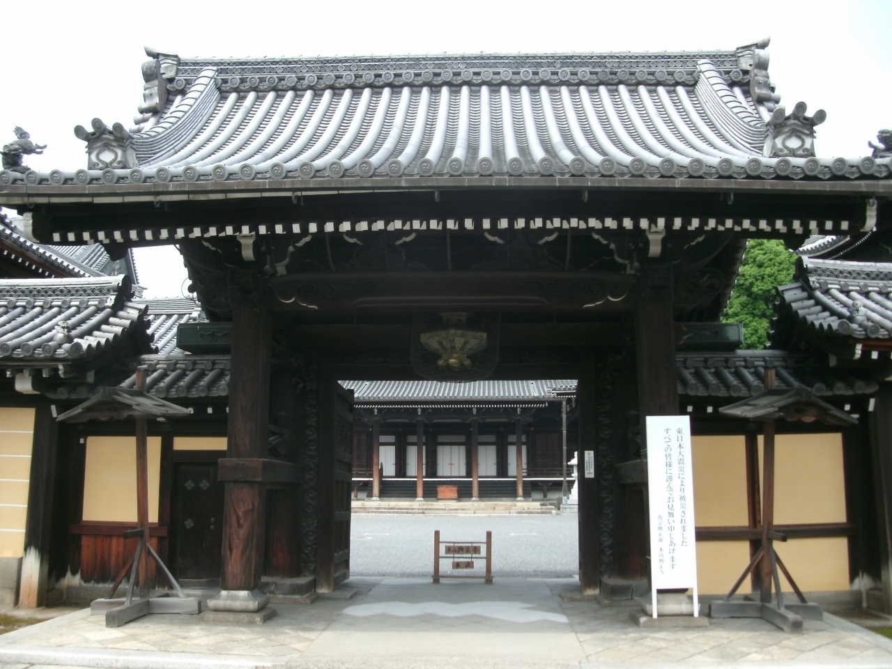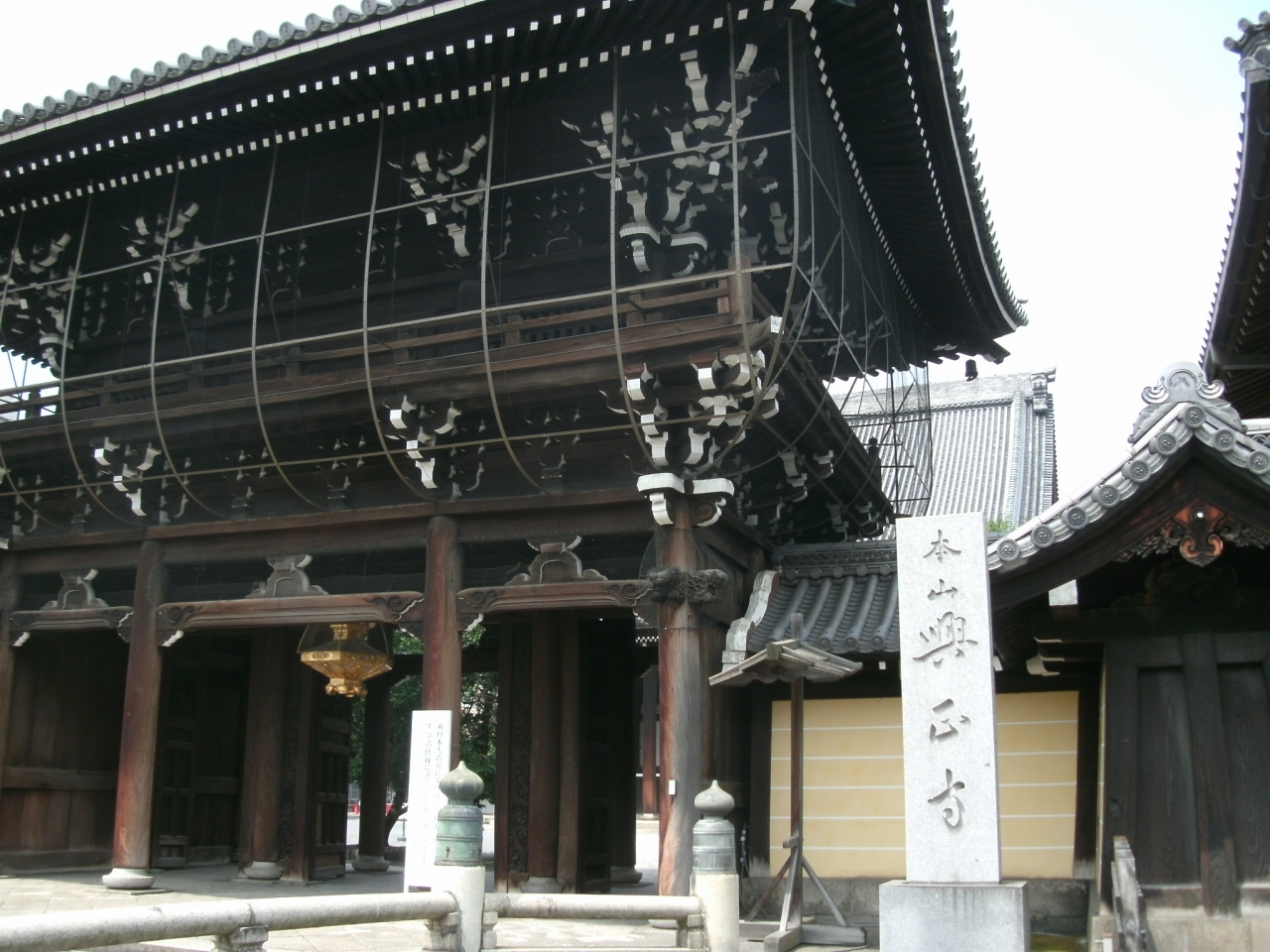 「興正寺」さんは、JR京都駅北西の七条堀川通の角に鎮座されています。真宗興正派の本山で、文明年間(1469-87年)に佛光寺の14世経豪が本願寺8世の蓮如に帰依し、佛光寺を弟に譲り、名を蓮教と改め、山科に一宇を建立したのが起こりとされています。佛光寺の旧称によって興正寺(興隆正法寺)と称しました。その後、石山本願寺とともに寺地を移転し、1591年(天正19年)現在地に移つりました。明治35年、火災により本堂その他ほとんどを消失、10年後に今の御影堂・阿弥陀堂が再建されました。西本願寺に南接する寺院ですが、塀が同じようにつながっていて一見同じ寺のように見えます。境内南に興正会館があり、一般の人も低料金で利用できる宿坊があります。