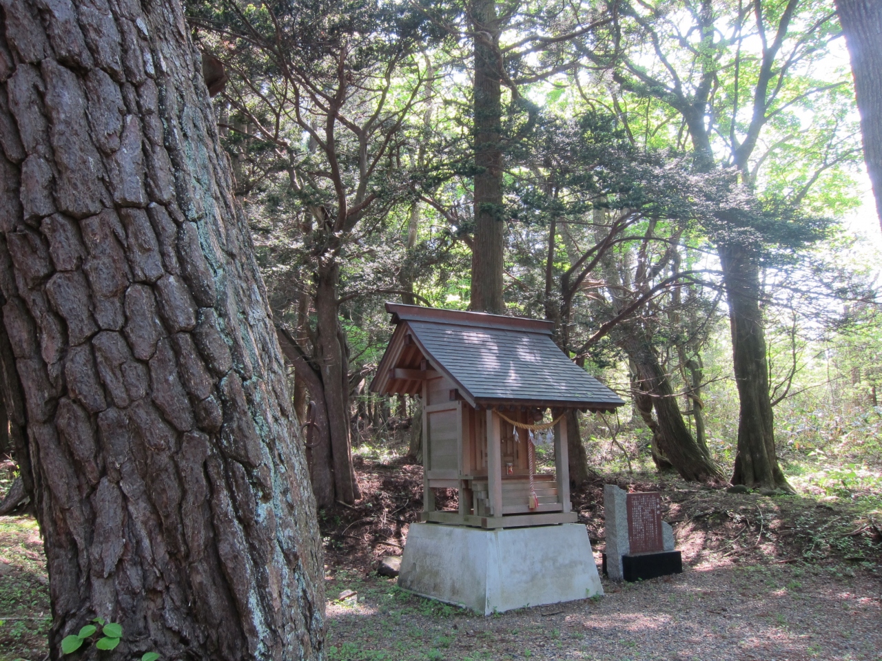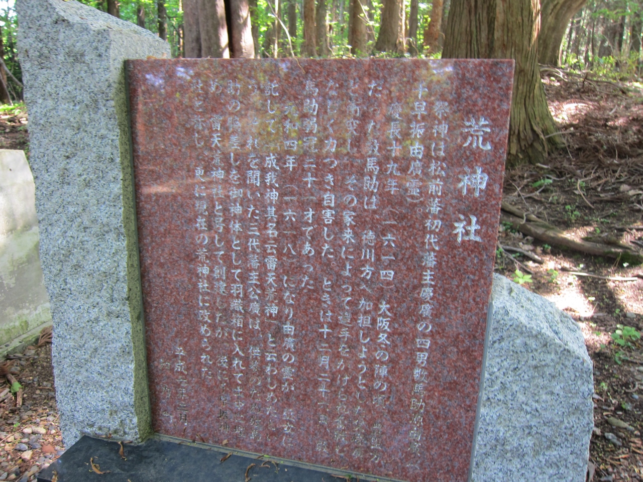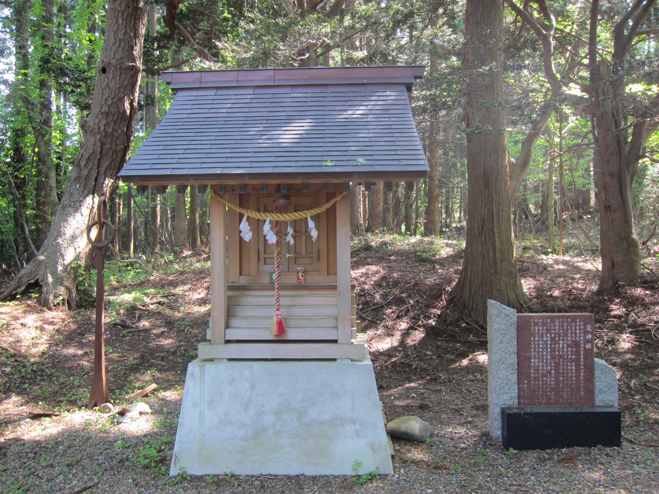知内町役場の南方、約500mほどの知内公園内にあります。知内公園が荒神社を中心に作られている感じで、公園の入口から参道の傾斜を登った奥に鎮座しています。祠といった感じで簡素ですが、徳川と豊臣の争いの中で起こった悲劇を現在に伝える証でもあります。祠の横の石碑に言われが書かれています。同じ公園内にある姥杉とは対照的ですが、併せてお参りしてみるとよいと思います。
