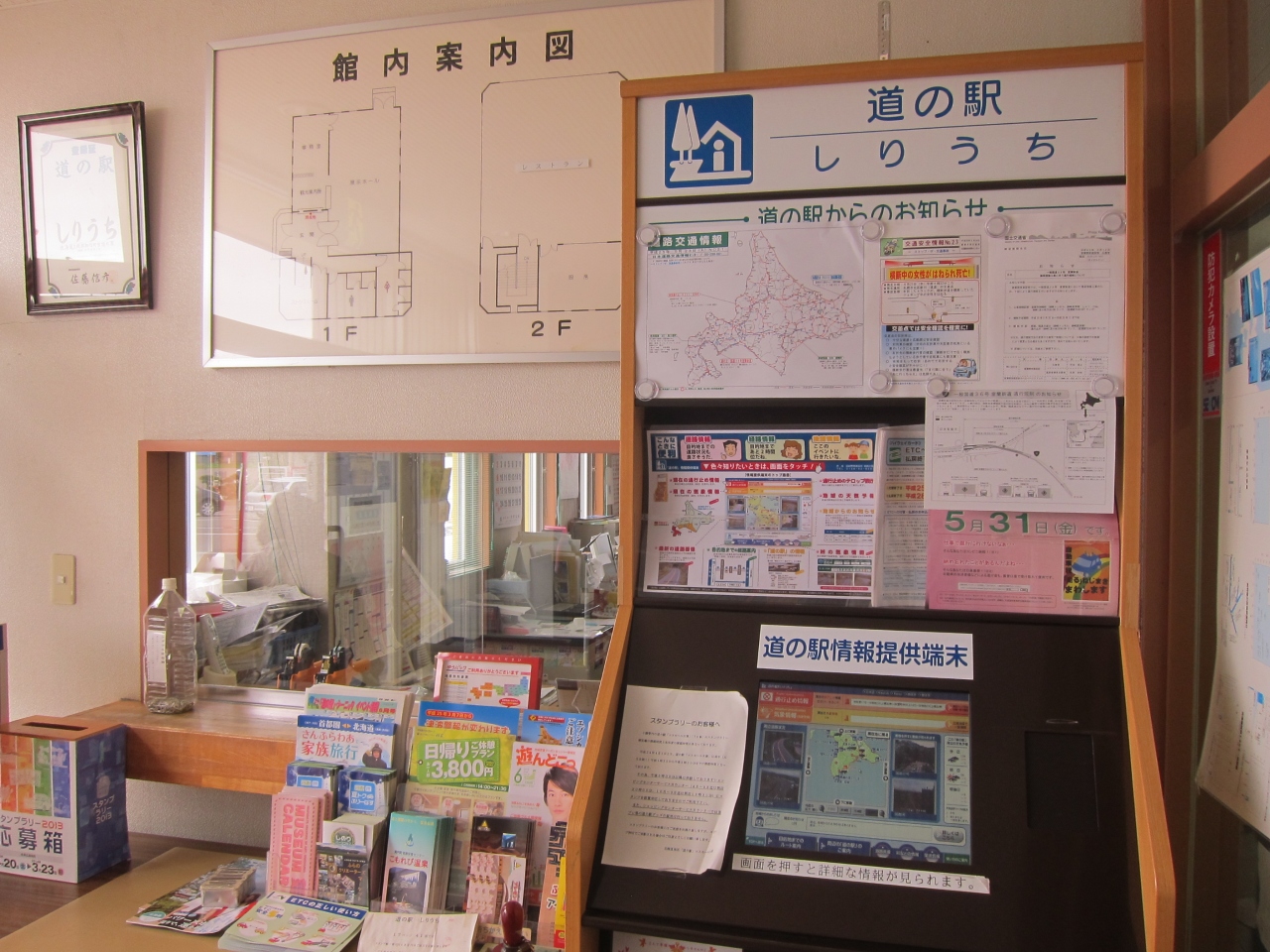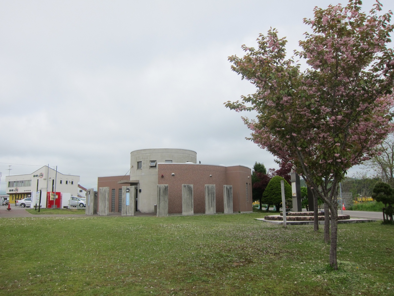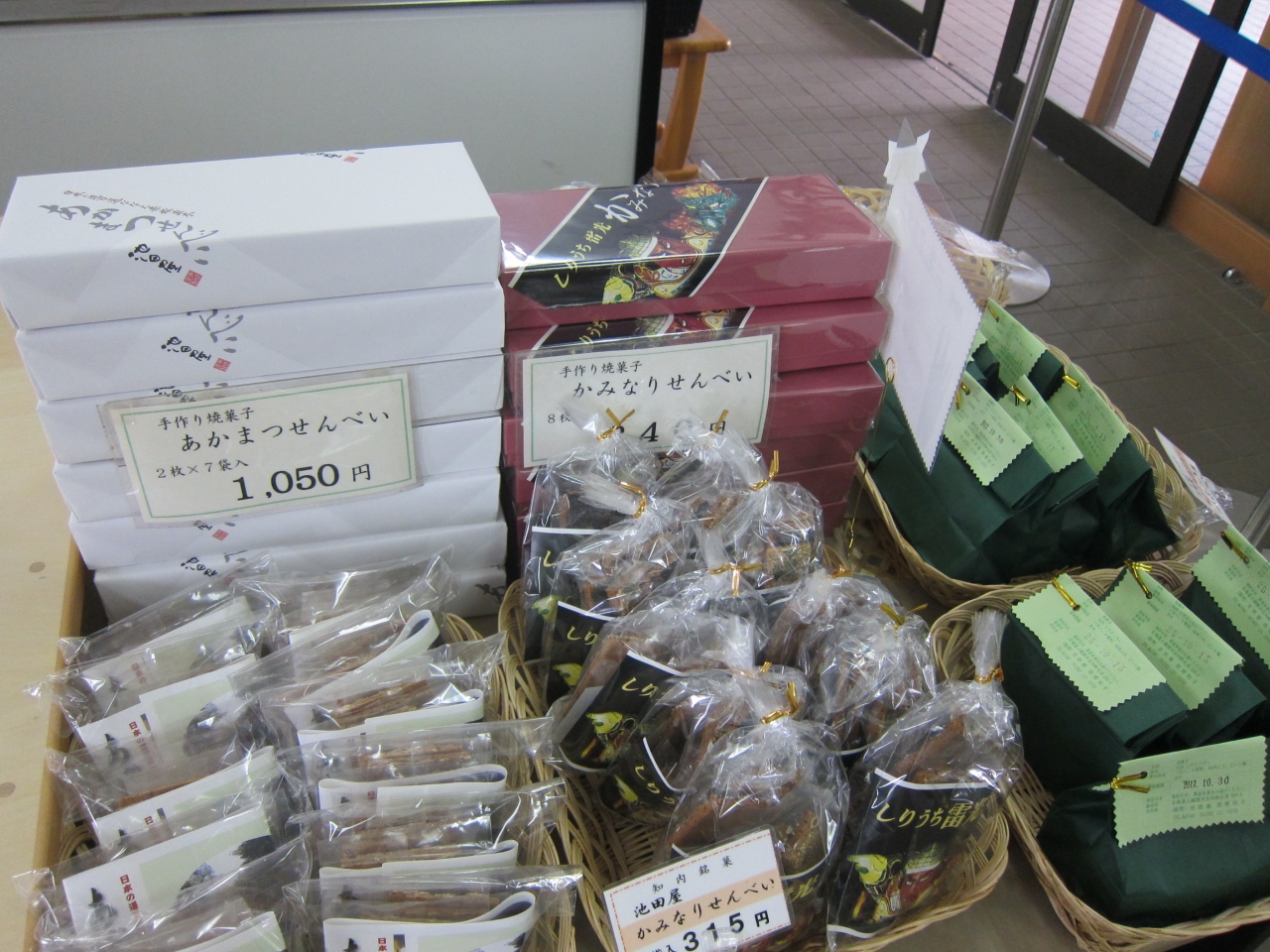 実際の鉄道の駅であるJR津軽海峡線、知内駅と併設しています。昔は道の駅で鉄道のきっぷも販売していたようですが、今は鉄道駅とは縁を切って関係ないといった感じです。そもそもJR知内駅は1日に特急が二往復しか停まりませんし、2015年度に新幹線ができたら知内駅はなくなってしまうかもしれません。さて、道の駅の方ですが、こちらも貧弱な感じがします。知内自体が、にらなど野菜が特産でほかに大したものが無いので、道の駅も観光案内所のほか、お土産コーナーに野菜や海産物、お菓子が多少並ぶ程度でした。しかしそれでも地元にしかない「かみなりせんべい」や当地の姥杉をモチーフにしたお菓子などがありました。付近で発掘されたストーンサークルなどの遺跡を模したトイレがあり、便利ですが、休憩にはやはり隣(福島町)の隣の松前の道の駅まで行った方がよいと思います。