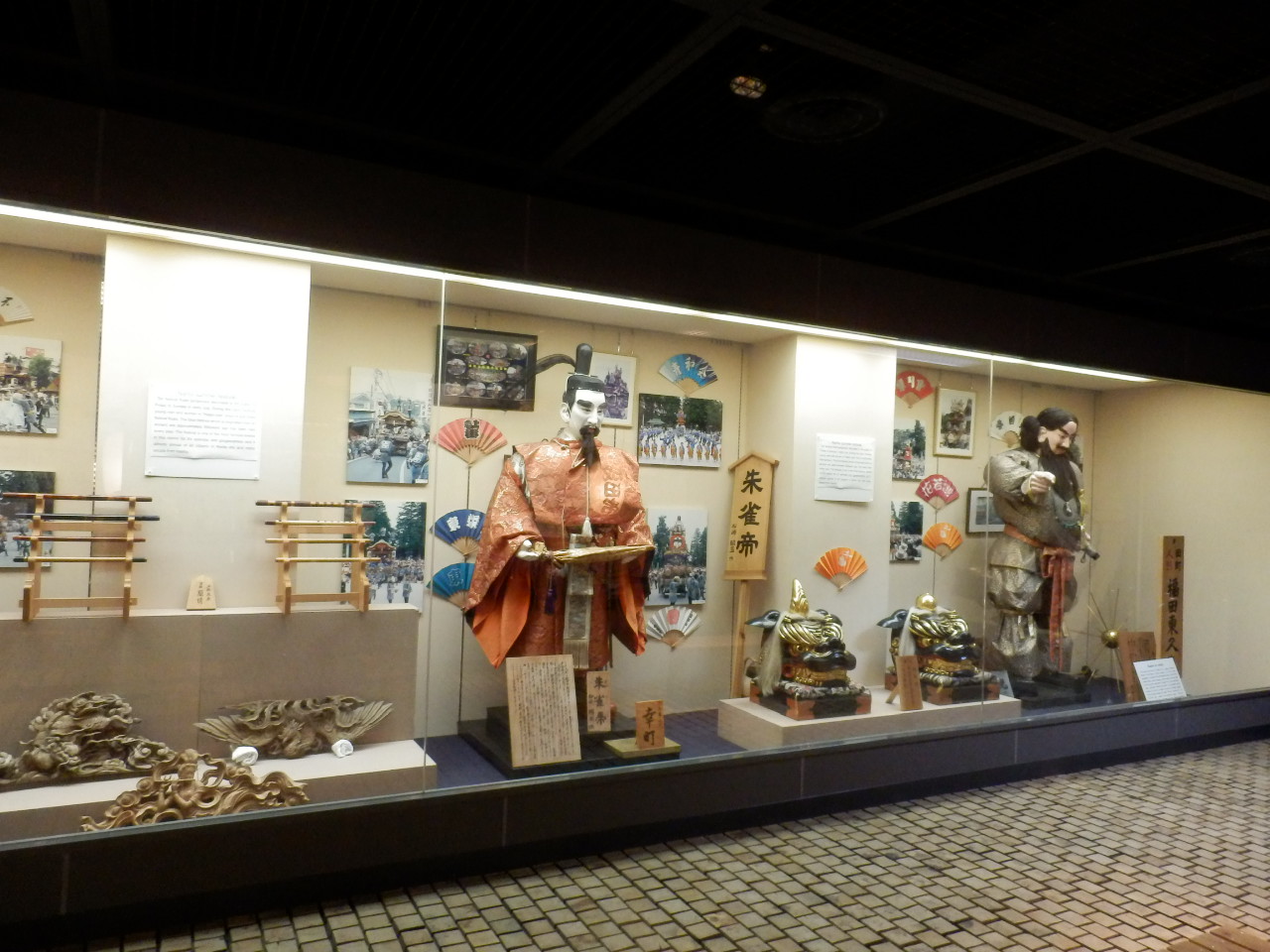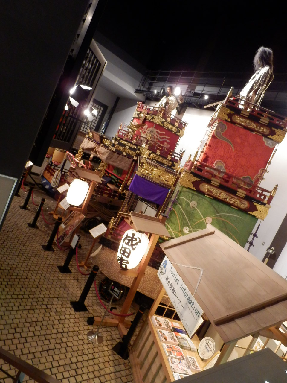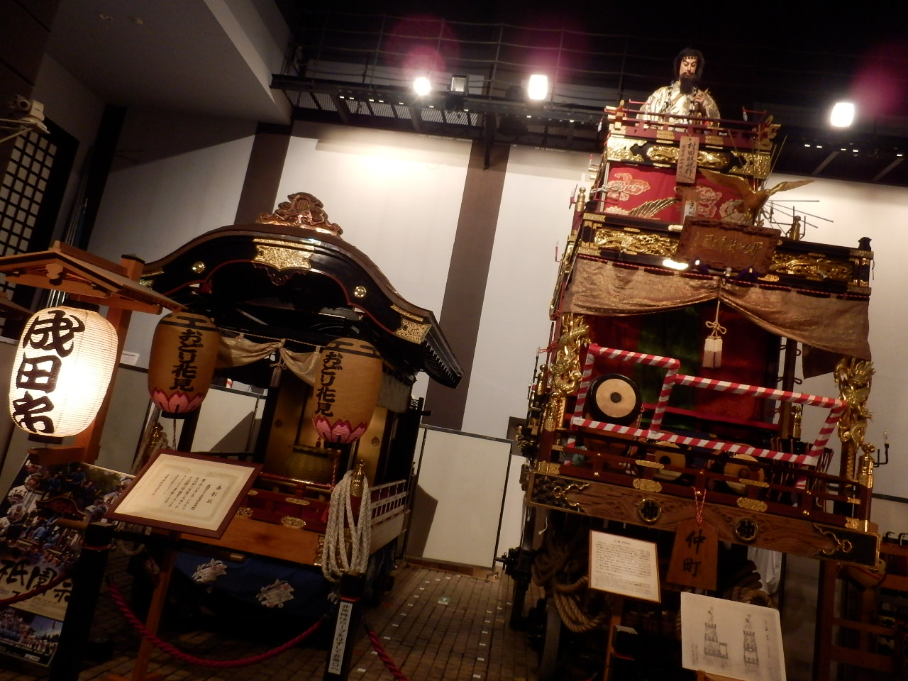 建物の入口にはパンフレットが多数置いてあります。また、成田の町を紹介する展示スペースもあり、建物奥の1階から2階には祇園祭りの山車が置いてあり迫力満点です。入場無料ですので、地図をもらうついでに立ち寄るのも良いと思います。