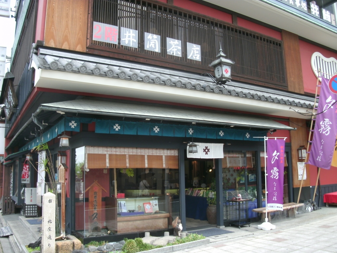 井筒八ッ橋本舗の本店です。四条大橋東詰め、京都四条南座の向かいから川端通りを少し北に行ったところにあります。1階はお土産を販売しており、広々とした店内にはお休み処も用意されていて、ゆっくりと選ぶことができます。家内と二人で祇園を散策したときに2階の“井筒茶店”で一服しました。加茂川の見える席で、“小倉善哉 680円”を頂きました。ふっくらと炊かれた大粒の大納言小豆に、栗と焼き餅が2個づつ入った善哉は、甘さもたっぷりで、添えて出された塩昆布を食べながら頂くと大変美味しいかった。大満足しました。お奨めの一服どころです。