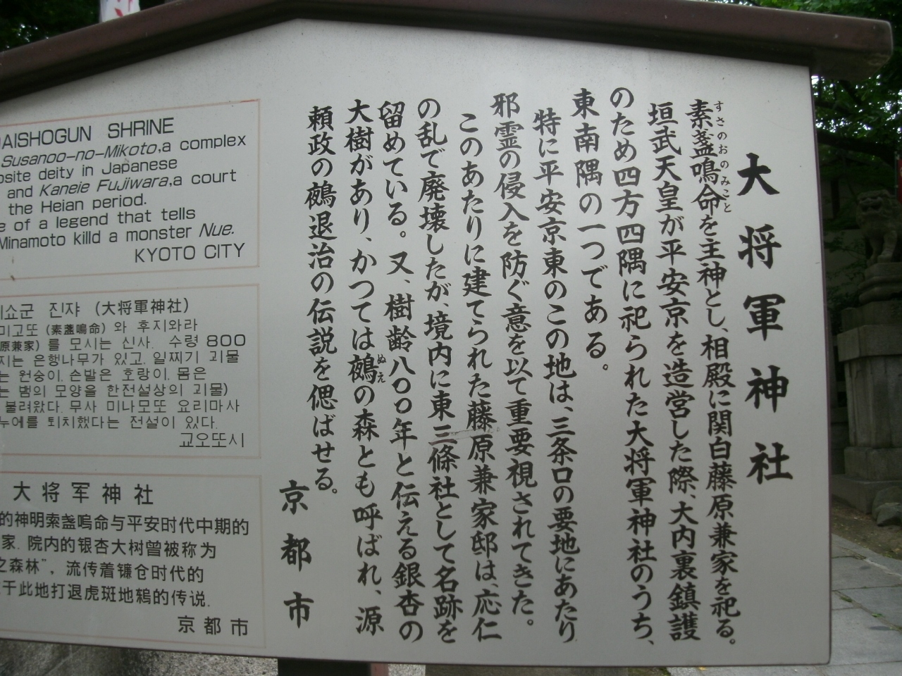 “大将軍”と名のつく神社は京都市内に3社あります。ここの「大将軍神社」さんは、京都市東山区に鎮座される神社で、東三条大将軍神社と称されています。素戔嗚尊(すさのうのみこと)を主祭神とし、相殿に藤原兼家を祀っています。794年(延暦13年)平安京造営の際、桓武天皇が大内裏鎮護のために都の四方に大将軍神社を祀った内の一つだそうです。特にこの地は京に入る七口の一つで、三条口の要地に当るため、邪霊の侵入を防ぐ意を以って重要視されていました。由緒ある神社ですが、訪れる観光客はほとんど無く、静かなところでした。