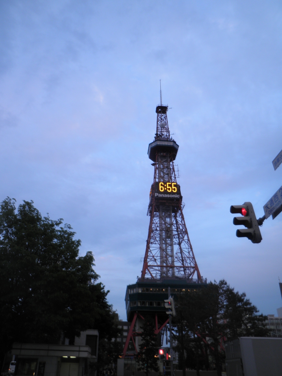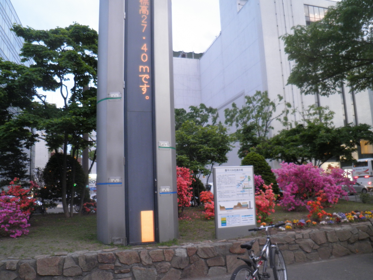 さっぽろテレビ塔塗装塗り替え工事中のはずですが、覆いはほとんど外されているようでした。 塔の近くに、豊平川水位表示塔があります。 札幌は扇状地なので、豊平川の水位を気にする必要があるとのことです。 そーいえば、昔は米里あたりで洪水があったような記憶があります。 それにしても変わった目的の塔ですね。