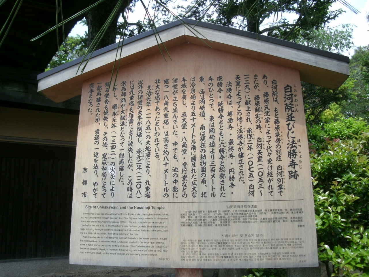現地に合った説明看板には『白河院は、もと藤原良房の別荘で、北家藤原氏によって代々受け継がれてきたが、藤原師実の時、白河天皇に献上され、承保2年(1075年)天皇によってこの地に法勝寺が建立された。法勝寺は、尊勝寺、最勝寺、円勝寺、成勝寺、延勝寺とともに六勝寺と総称された寺で、東は岡崎道より300m東、西は岡崎道、南は現在の動物園の南、北は冷泉通より50m南に囲まれた広大な寺域を有し、境内には、金堂、講堂、阿弥陀堂、法華堂、五大堂、八角堂、常行堂などの諸堂が立ち並んでいた。中でも、池の中島の八角九重塔は壮大な高塔であったといわれている。しかし、文治元年(1185年)の大地震により九重塔以外の諸堂の大半が倒壊し、更に康永元年(1342年)の火災により残る堂舎も焼失した。その後覚威和尚によって一部再建されたが、衰退の一途を辿り、やがて廃寺となった。』と表示されていました。
