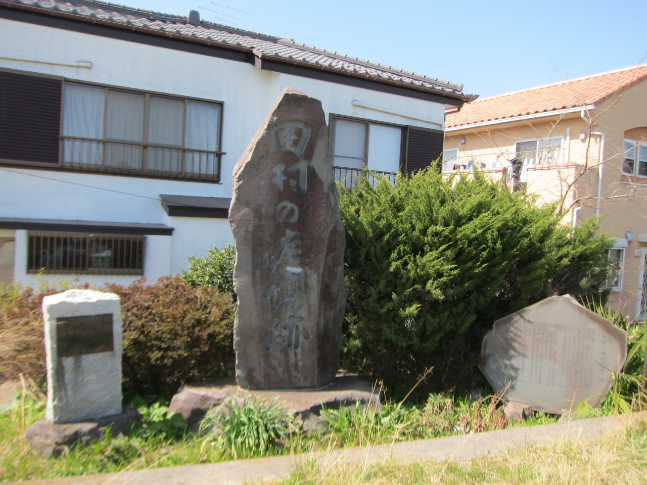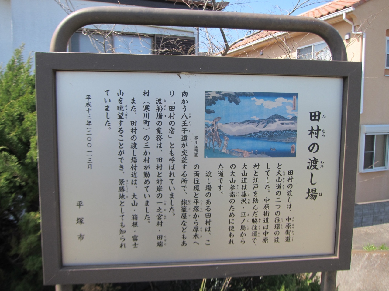 渡し場跡に石碑が建っています。場所は神川橋の平塚側、八坂神社と道路を挟んで反対側、土手の上の道路脇です。道路といっても車は入っていくことができません。この場所は、江戸時代もしくはもっと昔の鎌倉時代からあった相模川の渡し場の跡です。今でこそ田舎ですが、このあたりは東海道から伸びる大山街道や東海道のバイパスの中原街道が交錯する交通の要所でした。今も神川橋として相模川を越える交通の要衝です。すぐ近くの神川橋は高さがあり、橋上からは晴れた日には富士山や大山など眺めがとてもよいです。また、対岸の寒川町側の河原はスペースがあるため、よく家族連れなどがバーベキューなどをやっています。