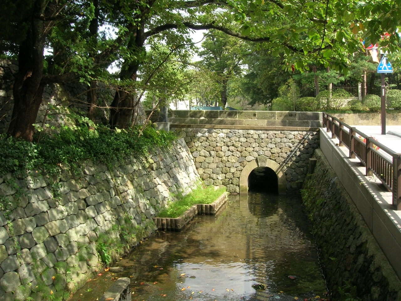 金沢21世紀美術館と金沢市役所の間の道路を南に下っていくと、古い石の欄干の橋を渡ります。橋には金文字で「宮内橋」。金沢城下町を取り囲んで作られた環濠である4筋の惣構のうち、西外惣構の堀を渡る橋です。本来の堀は15mぐらいあったそうなので、ずいぶん幅は狭くなっていますが、ちゃんと水が流れています。市役所側の脇には、金沢21世紀美術館の地下駐車場出口がありますが、その背後に大きなケヤキの木が。このケヤキの木の株もとがかつての堀の城側に土を盛り上げて作られていた土居(土るい)の高さだったようです。