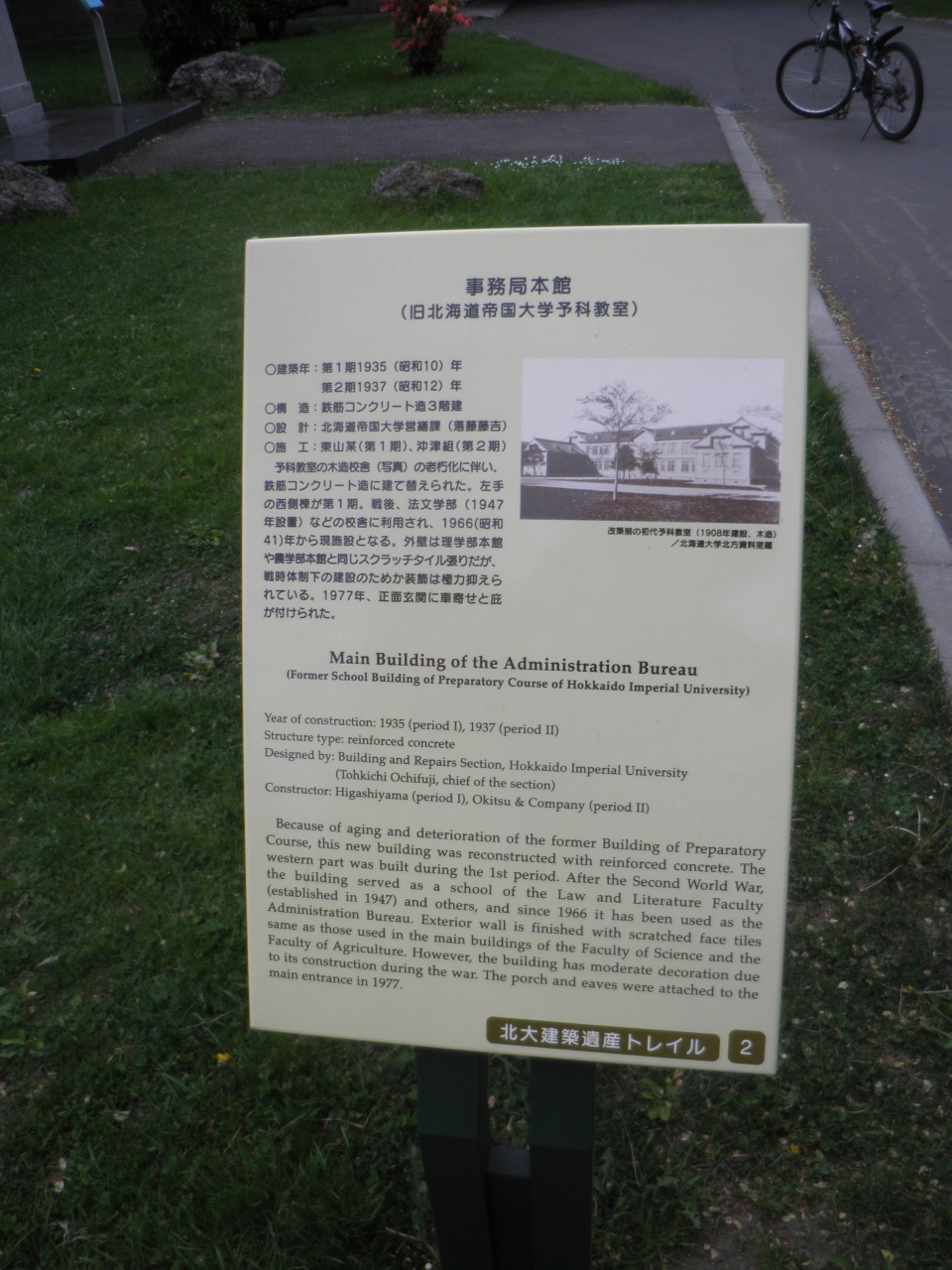 北海道大学の正門近くに立派な建物が、旧北海道帝国大学予科教室で、現在は事務局本部として使われているそうです。 前庭は緑が多くてツツジが咲いていました。 大学祭でキャンパス内は賑やかでしたが、ここには初代総長の佐藤昌介の胸像や「大志を抱いて」の大きな碑などがあって落ち着いた感じでした。
