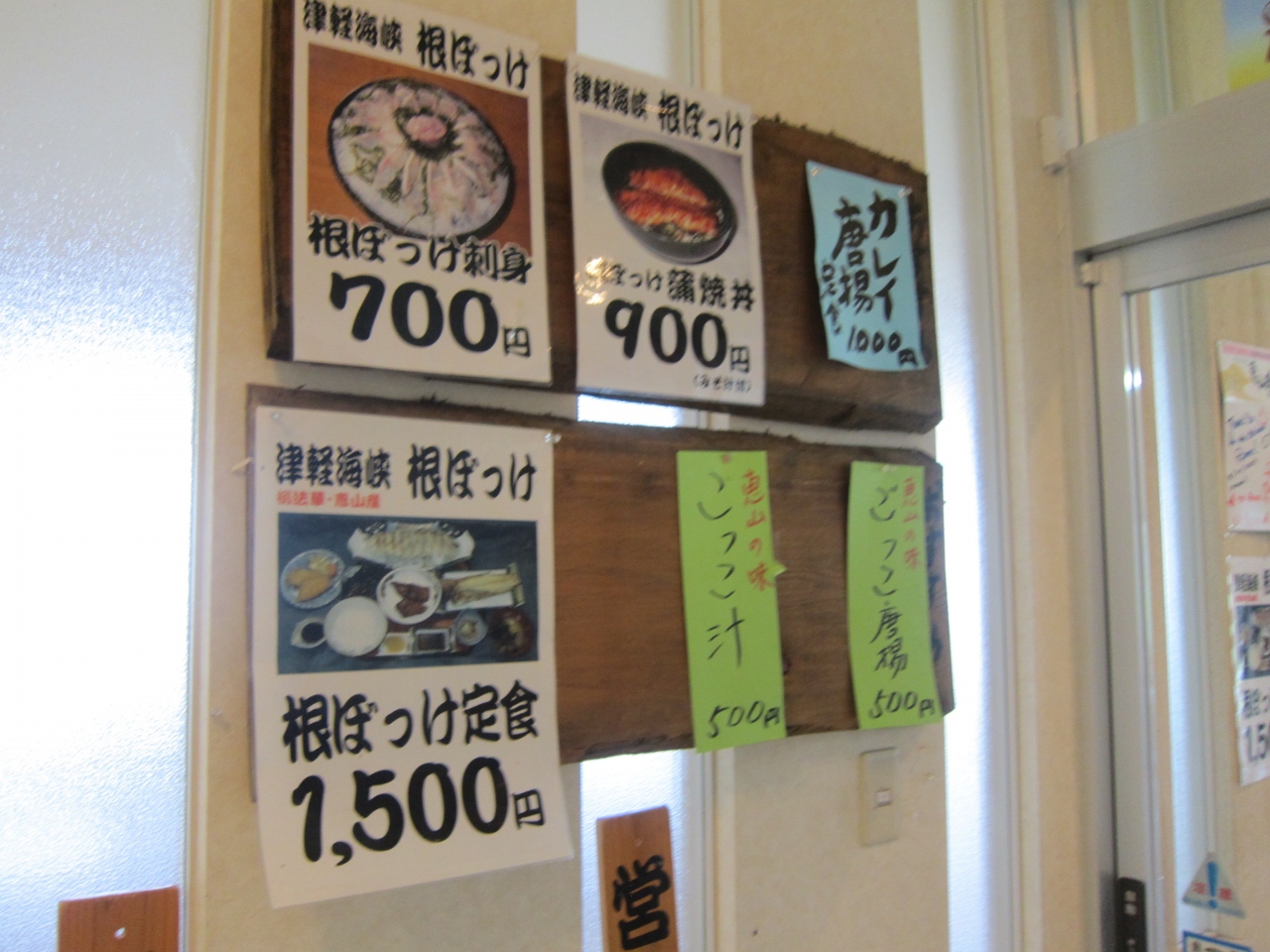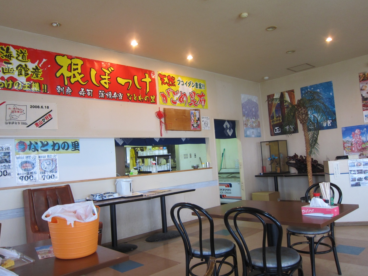 道の駅なとわ・えさんの中に入っている食堂です。がごめ昆布の塩ラーメンや根ぼっけのさしみ、蒲焼、定食などがあります。塩ラーメンは函館でも食べられそうなので、根ぼっけを頼むことにしました(恵山の味、ごっこ汁・唐揚も気になりましたが…)。定食がさしみも含んでいたので頼もうとしましたが、遅い時間だったこともあり、売り切れとのことでした。残念!しかし代わりの根ぼっけ蒲焼もおいしかった!しかし他にも鹿肉を使ったメニューの表示のない隠れメニューがあるようです。他のお客さんが交渉して頼んでいました。知る人のみぞ知る料理で、ご主人が即興で思いついた料理を作っていました。生まれてこのかた、ずっと恵山で食堂を経営している夫婦が切り盛りする食堂です。お客さんがいない時は話しの花をつつじに負けないくらい咲かしてくれます。テレビでも紹介された店で、結構お客がきて、根ぼっけが品切れになってしまうくらいですが…。