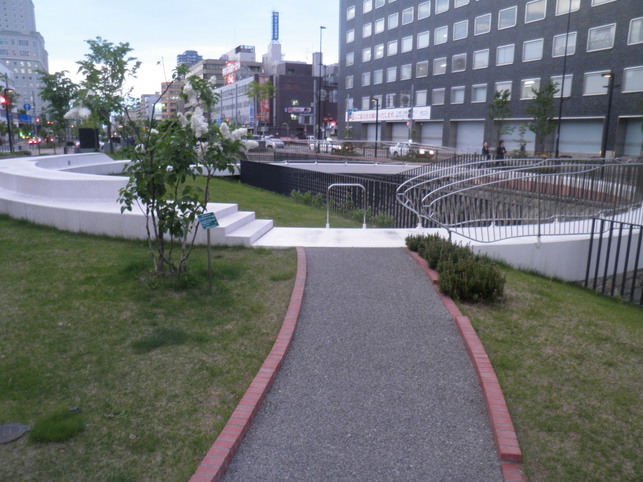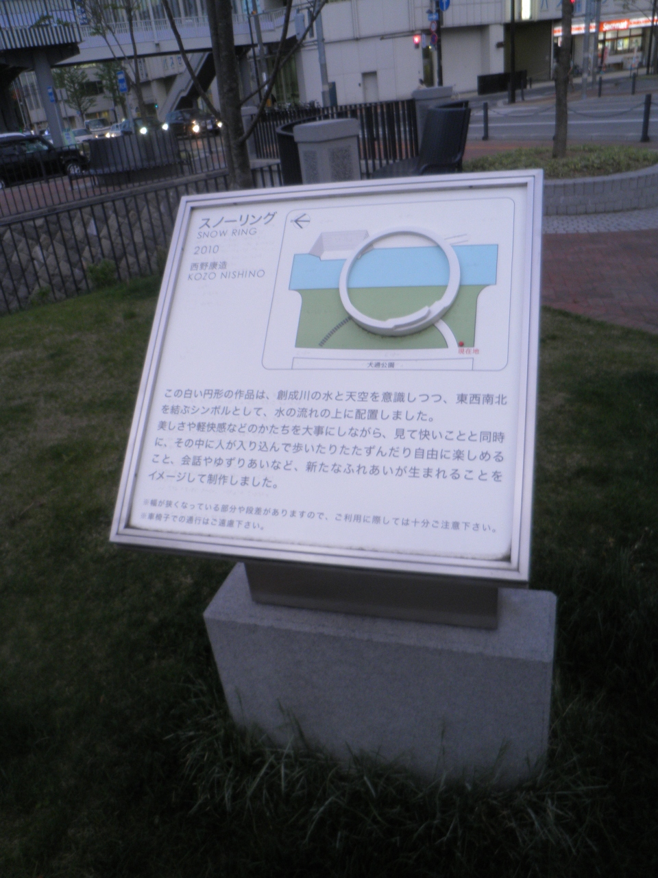 大通公園の端にたつ札幌テレビ塔の後ろに創成川が流れていて、川をまたぐように白い大きな輪がかかっています。 スノーリングという芸術作品なんだそうです。 ただ、創成川の公園は幅が狭くて、大通公園みたいな居心地いい公園がすぐ側にあるから、あんまり人気ないみたいです。