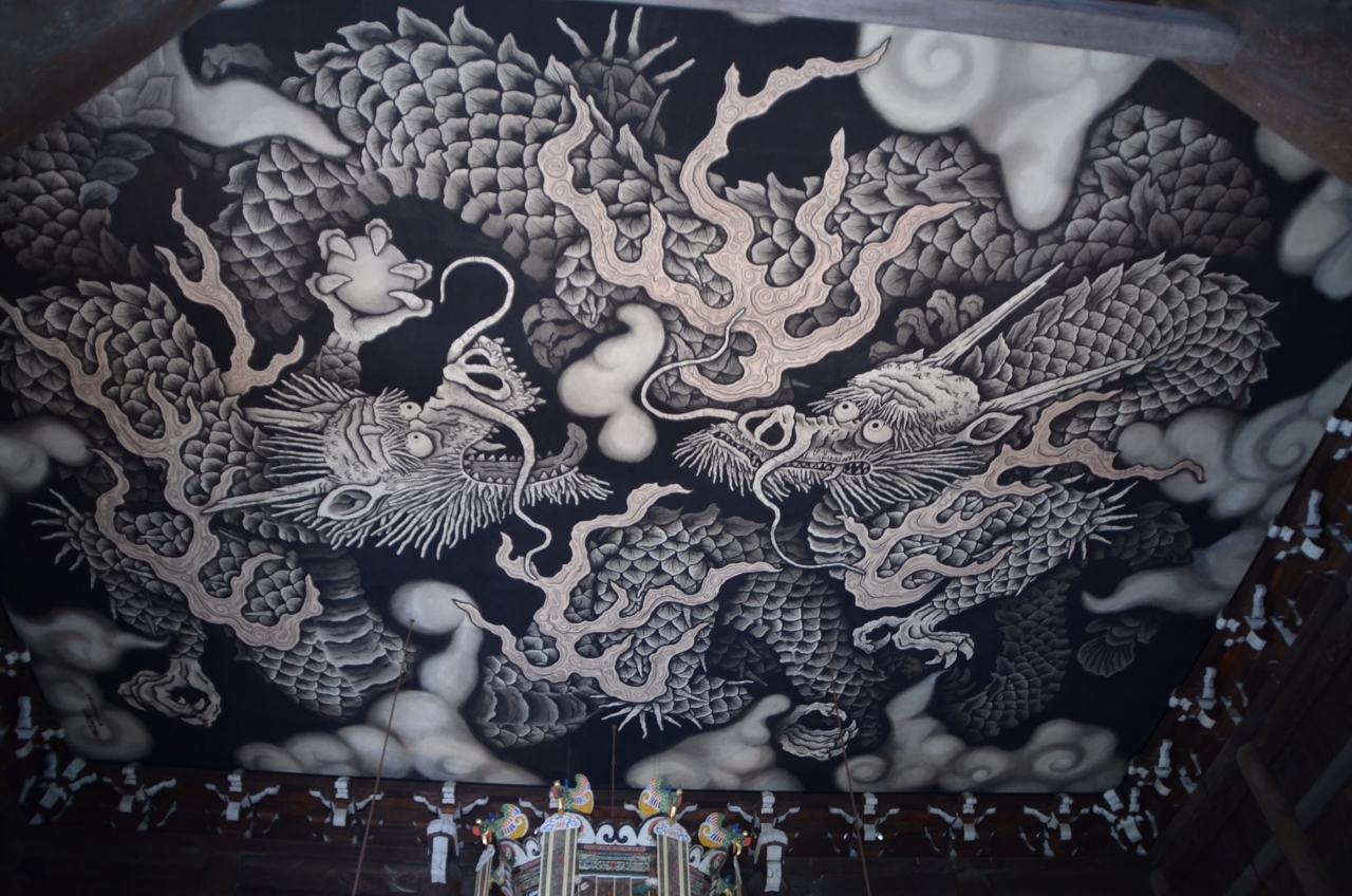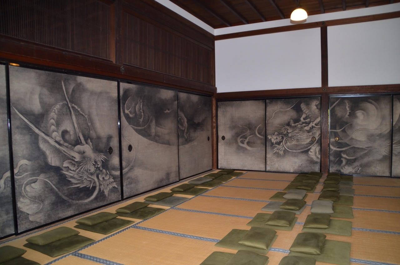 今回の訪問の目玉は、俵屋宗達筆による国宝「風神雷神図屏風」である。もちろんオリジナルは常時は公開されていない。しかし、ここで展示されている複製は、京都文化協会とキャノンにより開発された最新鋭の高度な技術を採用し製作されたものだ。デジタルカメラで多分割撮影し、高精度なカラーマッチングを行い、特性の和紙に大判インクジェットプリンターで出力。これに金箔や表装などの京都伝統工芸の技を加えて、オリジナルに限りなく近い複製を完成させた。また、重要文化財である「建仁寺方丈障壁画」も5年の歳月をかけて昨年完成した。制作された当時のオリジナルの迫力が伝わってくる。