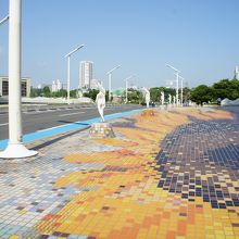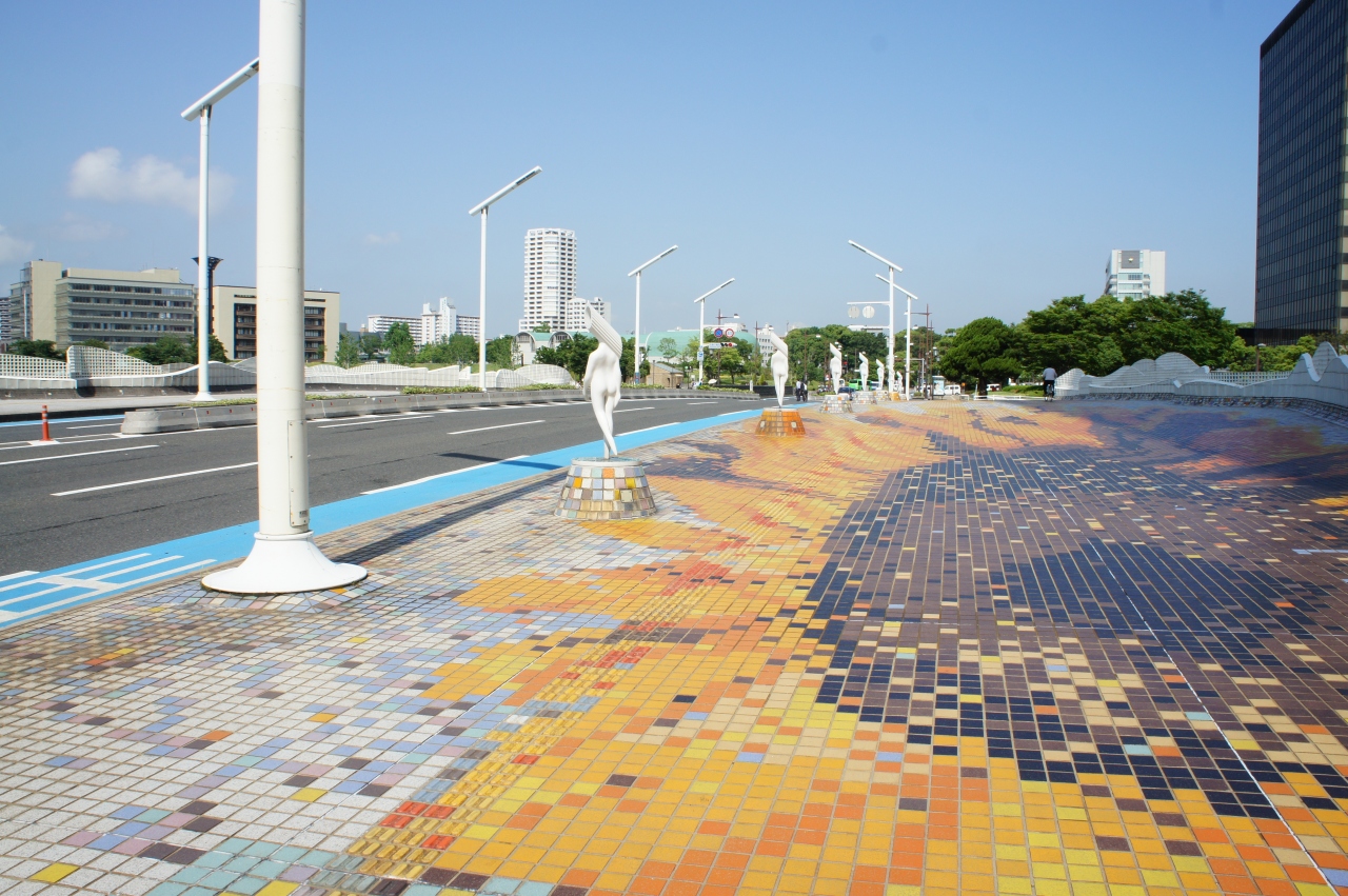 中の橋、通称、太陽の橋は、旦過市場から小文字通りを通って、小倉城に向かう途中。紫川にかかる大きな橋です。橋の歩道には、顔がマカロニの人体オブジェ。こちらを向いたお尻が見えた時にはちょっとぎょっとしてしまいました。地面には、大きなひまわりの絵が描いてあって、現代アートがけっこう楽しめる橋だと思います。