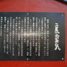 滝尾神社境内に湧く「酒の泉」と恒霊山から湧く「薬師の霊水」の2つが流れ込む小さな泉。この水を飲むと眼病が治り、若返るとも言われる