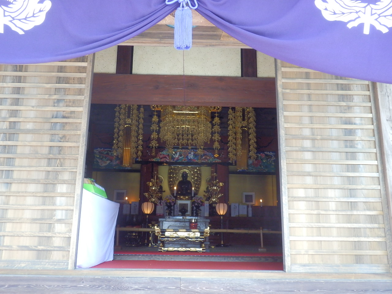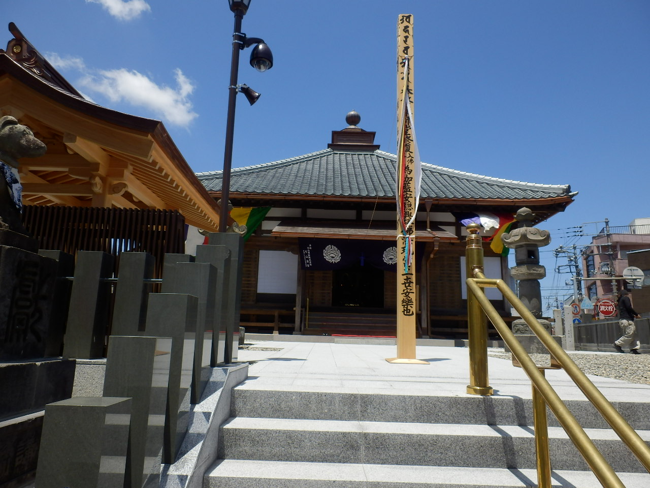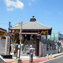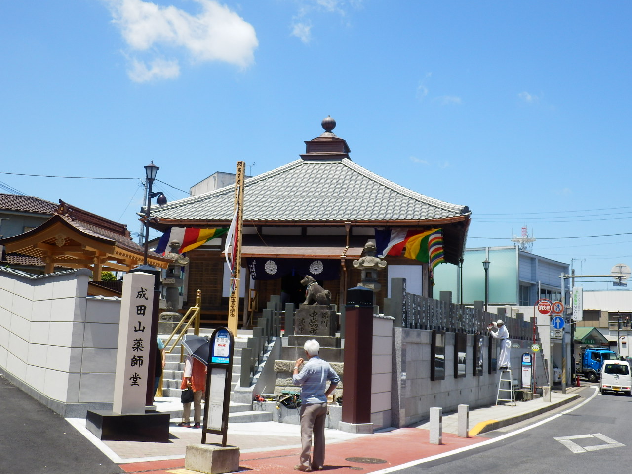 成田駅から成田山へ繋がる参道の中間あたり、参道が折れ曲がり三叉路になっている交差点の角地にあります。ここは成田山新勝寺の飛び地で、薬師堂は光明堂が本堂になる前の旧本堂だそうです。2年かけた保存修復工事が終わったばかりで綺麗でした。