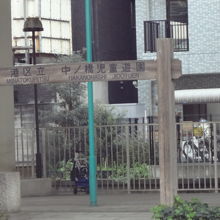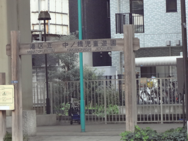 首都高のガード下に「中ノ橋児童遊園」の表示があり、小さなお子さんをベビーカーに乗せたお母さんの姿が見えました。