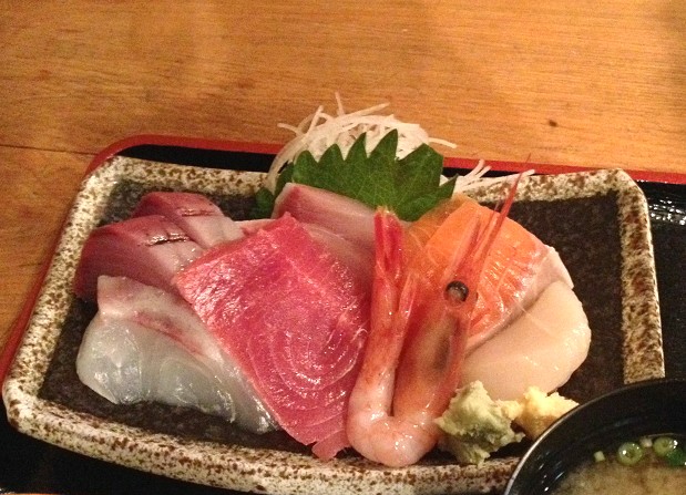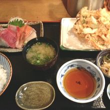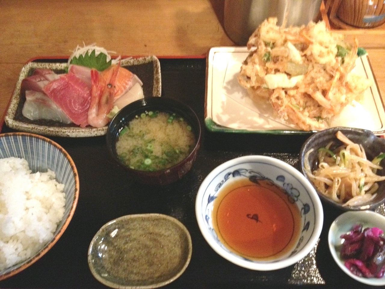 刺身盛りと海鮮かき揚げにしました、汁物と香の物付です。